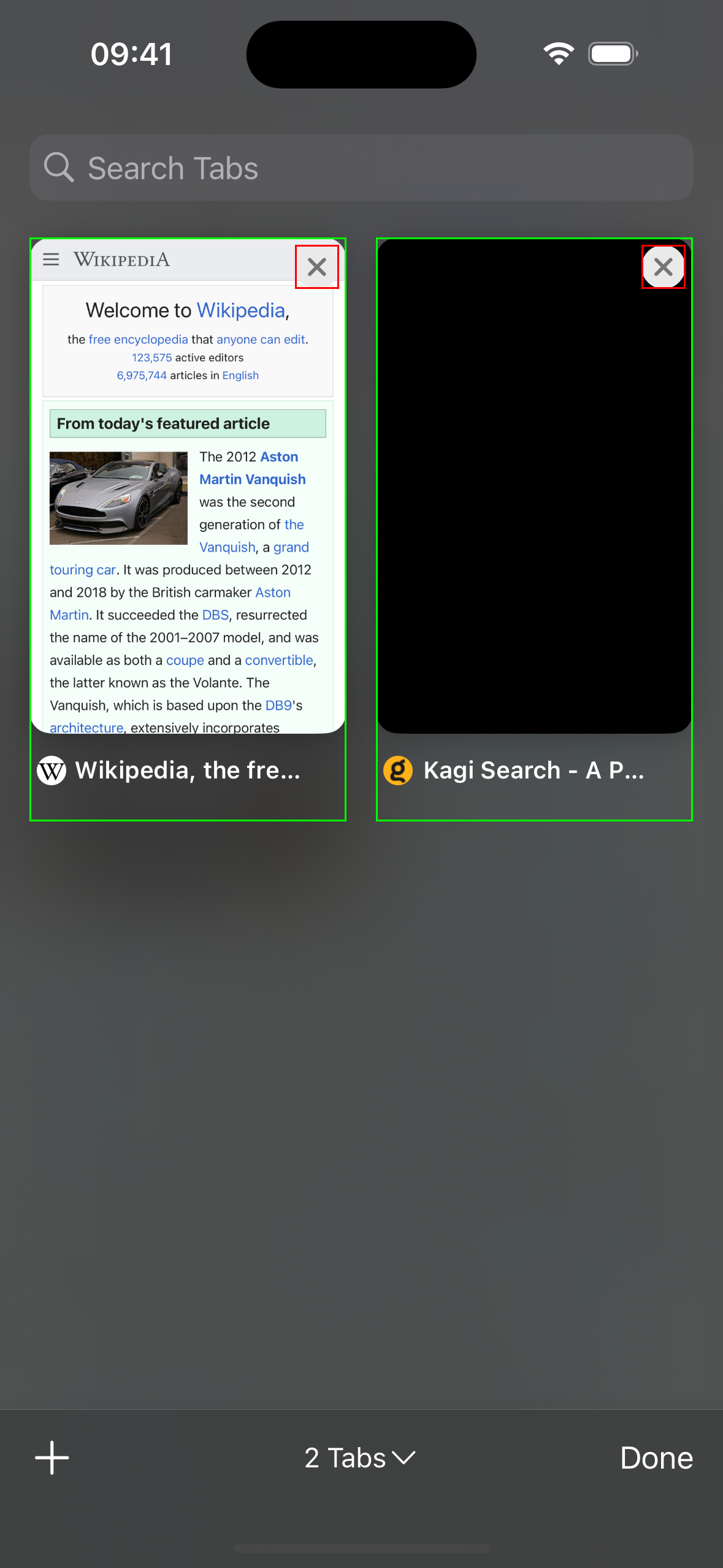 When in the tabs view, trying to close a tab is a hit-or-miss deal, mostly miss, because the close-tab button is too small to dependably hit. I like the list view, but in that view it was damn near impossible to close rather than select a tab. This thumbnail view is a bit better on that matter, but not enough better. Have a look: