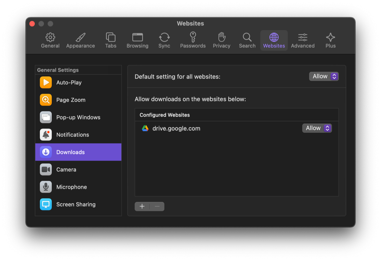 In the screenshots below I showed the steps I’ve done to allow download form Google Drive by allowing that website to download both on the web app and in the browser profile settings, but it just does not download. Happens to all websites that I’ve set up as a web app, not just google Drive.