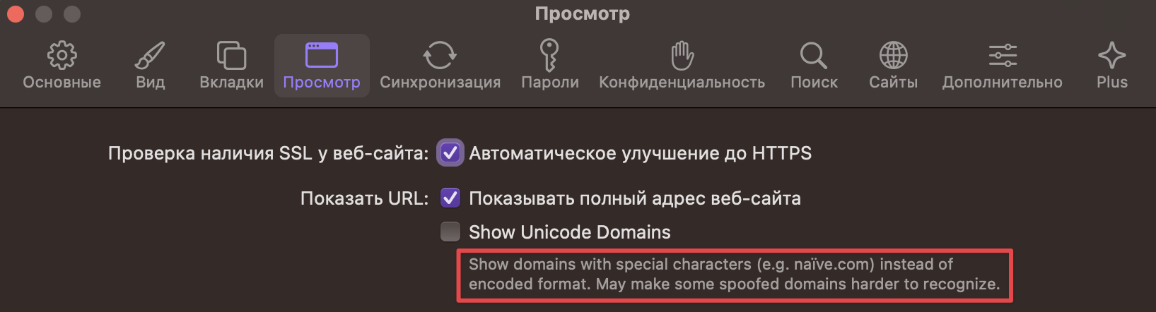 - The tooltip text for "Show Unicode Domains" is displayed correctly in English but could also be localized.