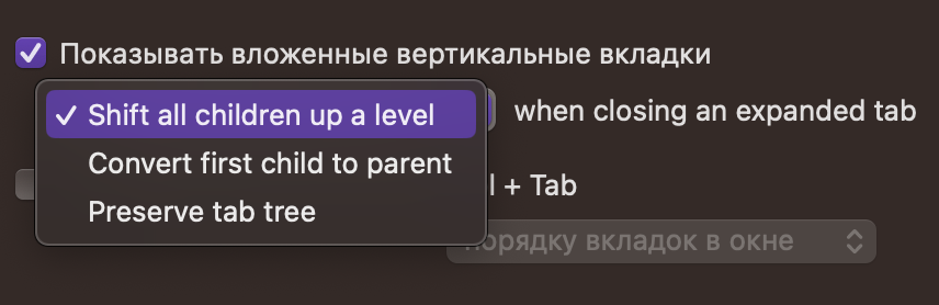 The screenshot shows a settings interface for tab behavior configuration, specifically for determining what happens when closing expanded tabs in a vertical tab view. The primary checkbox and potentially other UI elements have Russian translations, but several strings remain in English.