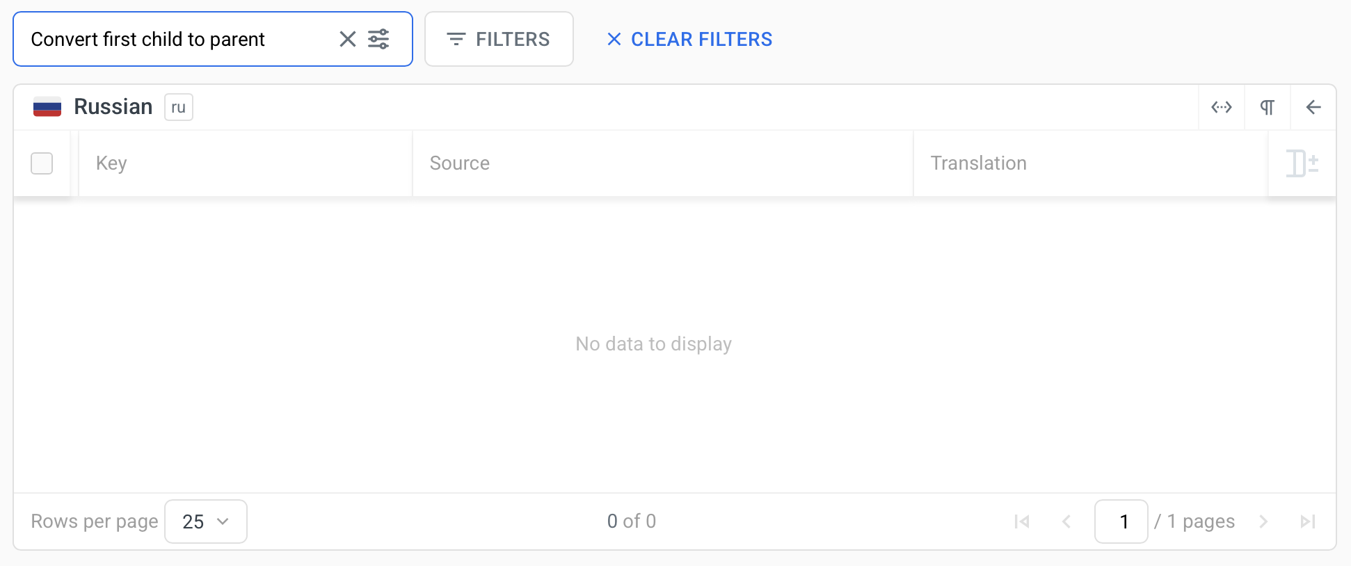 The "Convert first child to parent" button should be translated to Russian, consistent with the rest of the interface. The appropriate Russian translation would likely be "Поднять первую подвкладку на уровень выше"