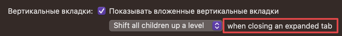 The screenshot shows a settings interface for tab behavior configuration, specifically for determining what happens when closing expanded tabs in a vertical tab view. The primary checkbox and potentially other UI elements have Russian translations, but several strings remain in English.
