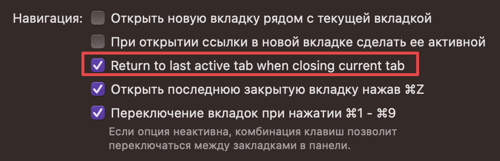 The setting "Return to last active tab when closing current tab" appears in English within the Russian UI, despite other surrounding text being properly translated to Russian.