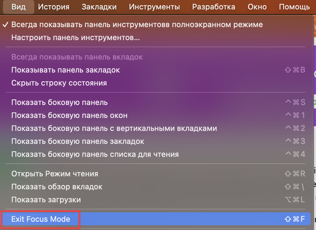 - Observe that "Exit Focus Mode" text remains in English rather than displaying Russian translations