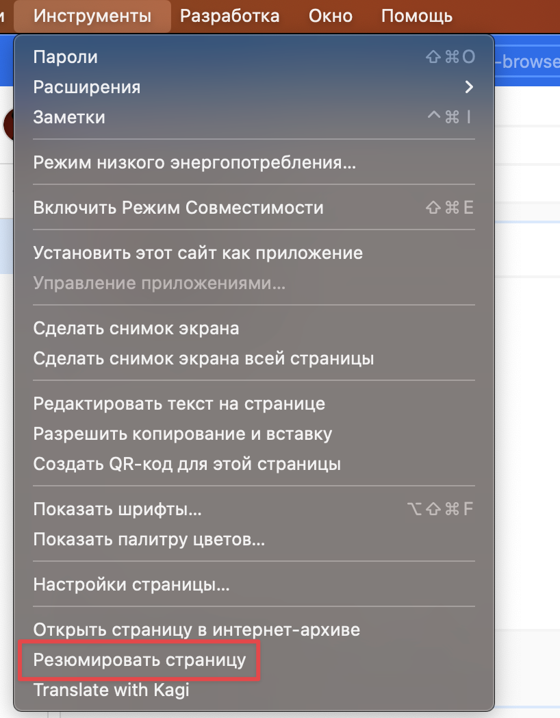 - The Russian interface with "Резюмировать страницу"