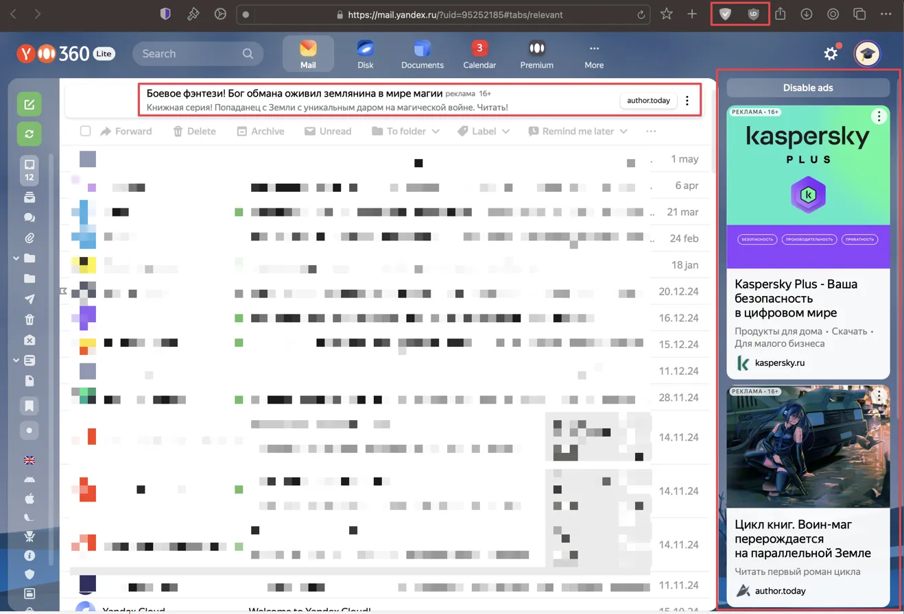 - Multiple Russian-language advertisements are displayed in the mail interface