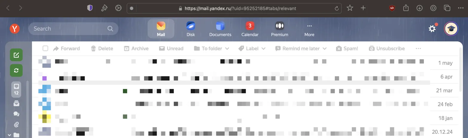 The cntblock.txt filter list from EasyList does not appear to be working effectively in the Orion RC browser when viewing mail.yandex.ru:
