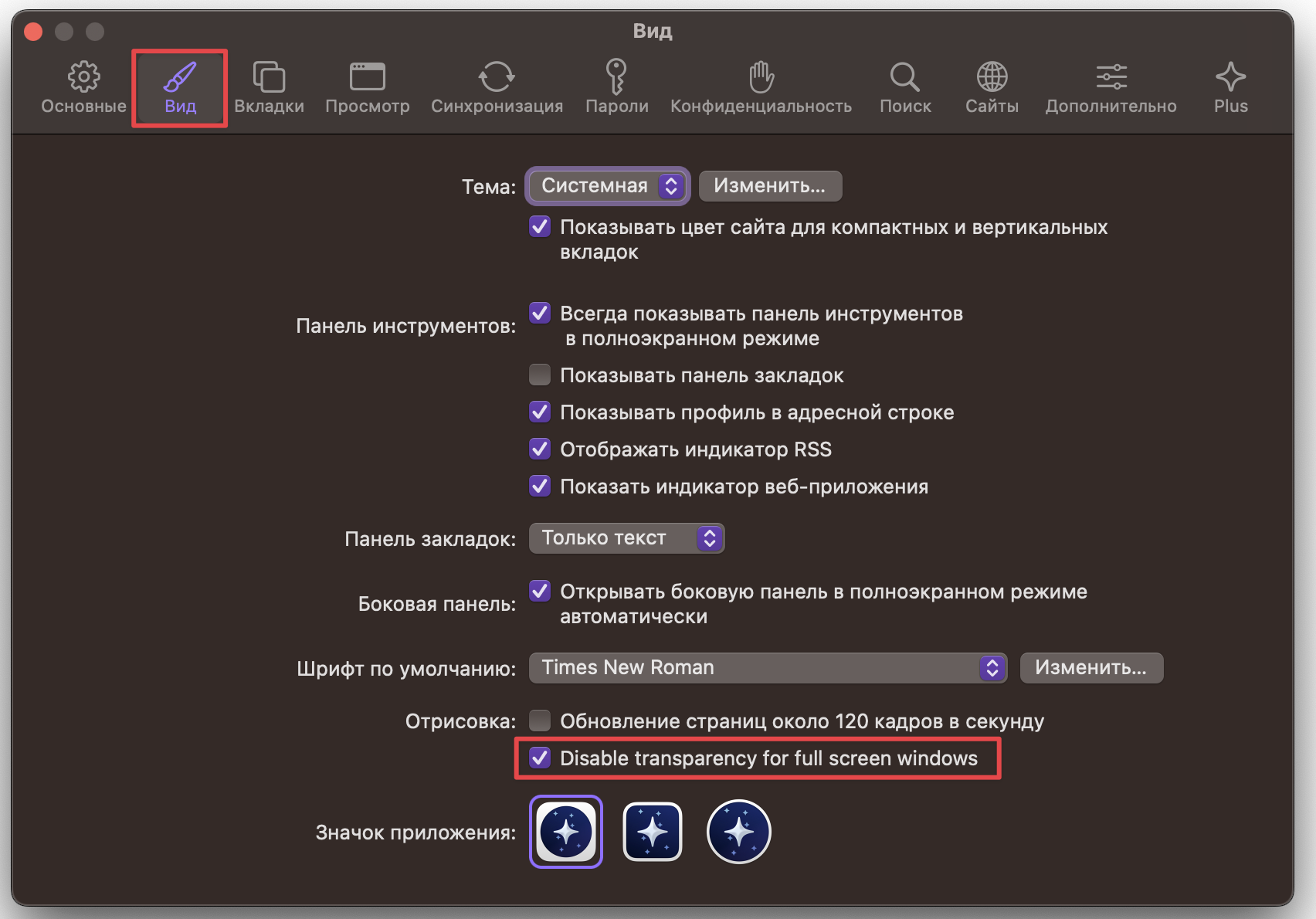 - Correct translation should be: "Отключить прозрачность для полноэкранного режима"