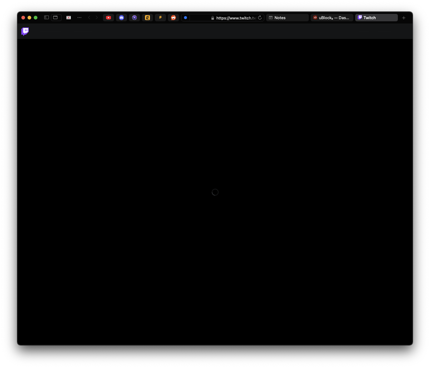 Likely an extension issue. I was able to reproduce it by cmd+click to a new tab. I think it's an issue between Youtube and uBo because if Youtube is set to 'deny' in uBo configure list, it loads Twitch correctly.