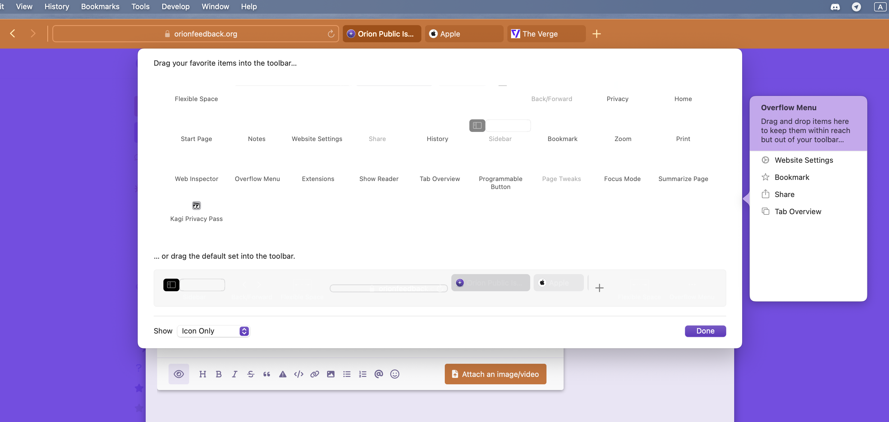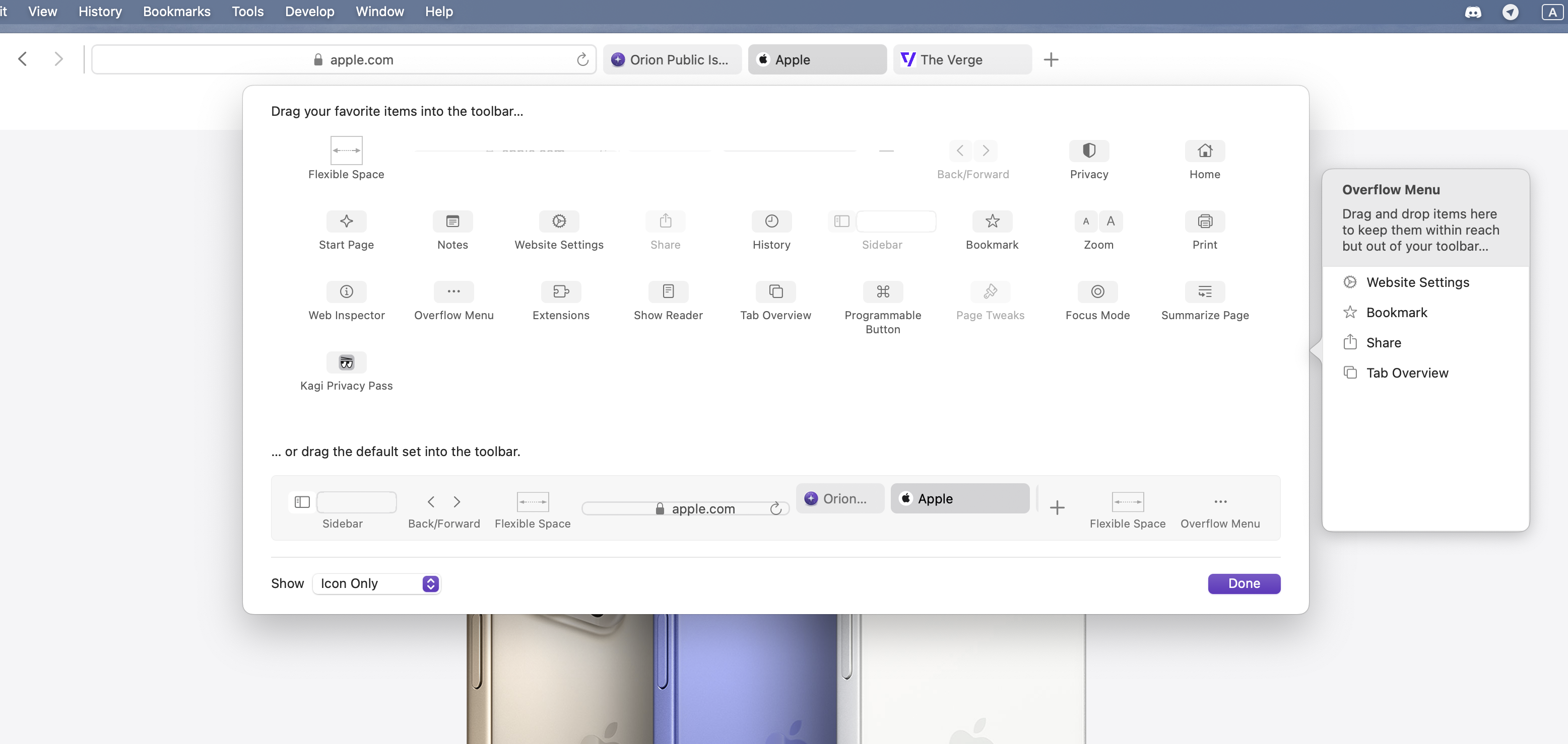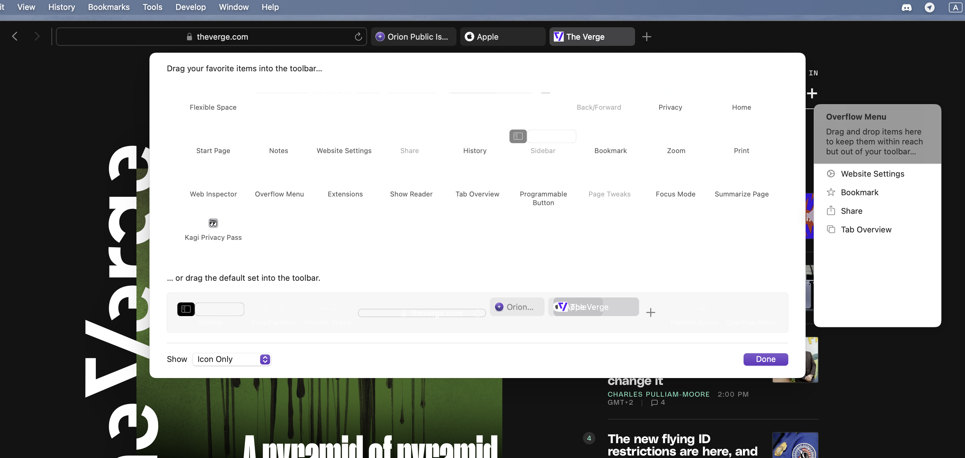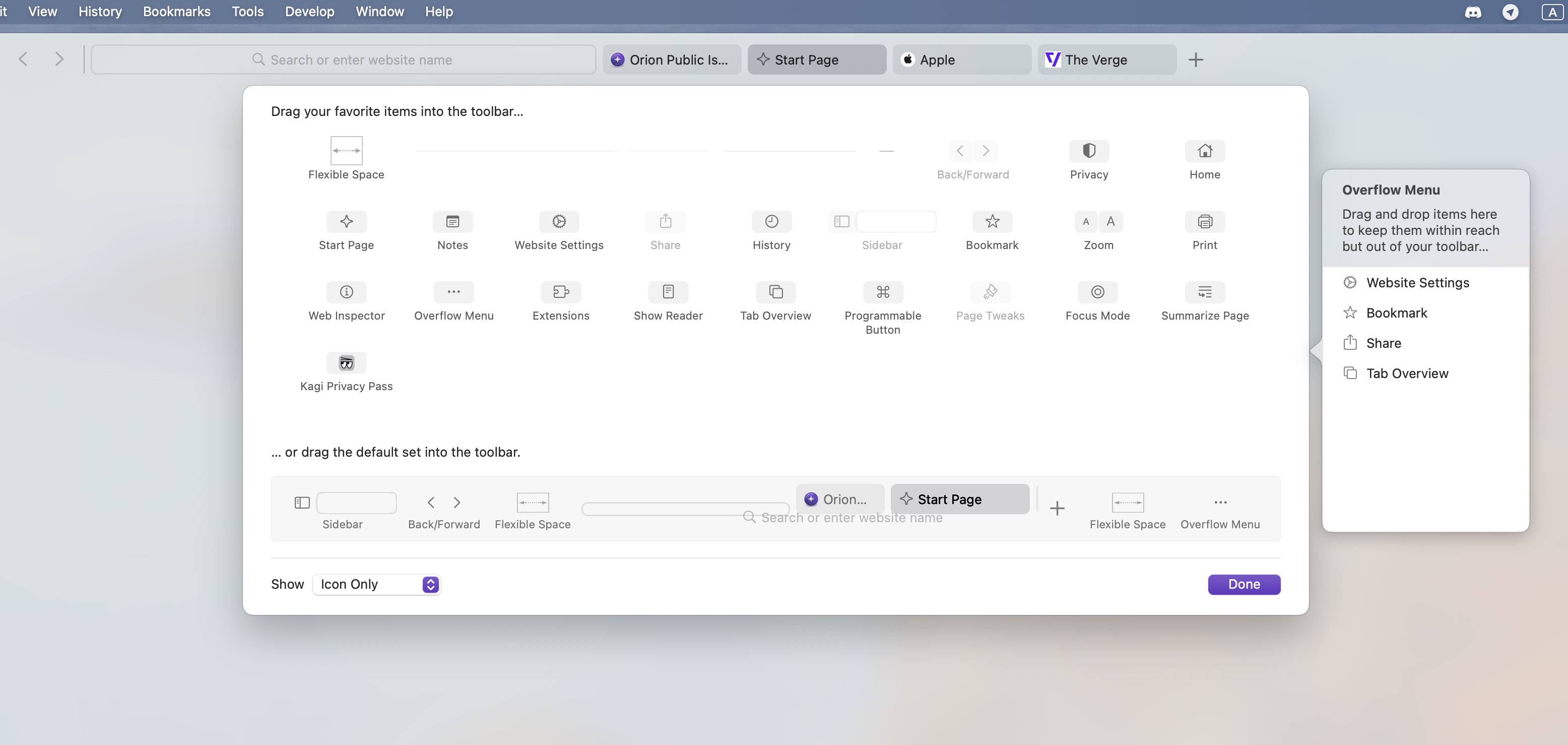 Open different websites and open "Customise toolbar" menu: