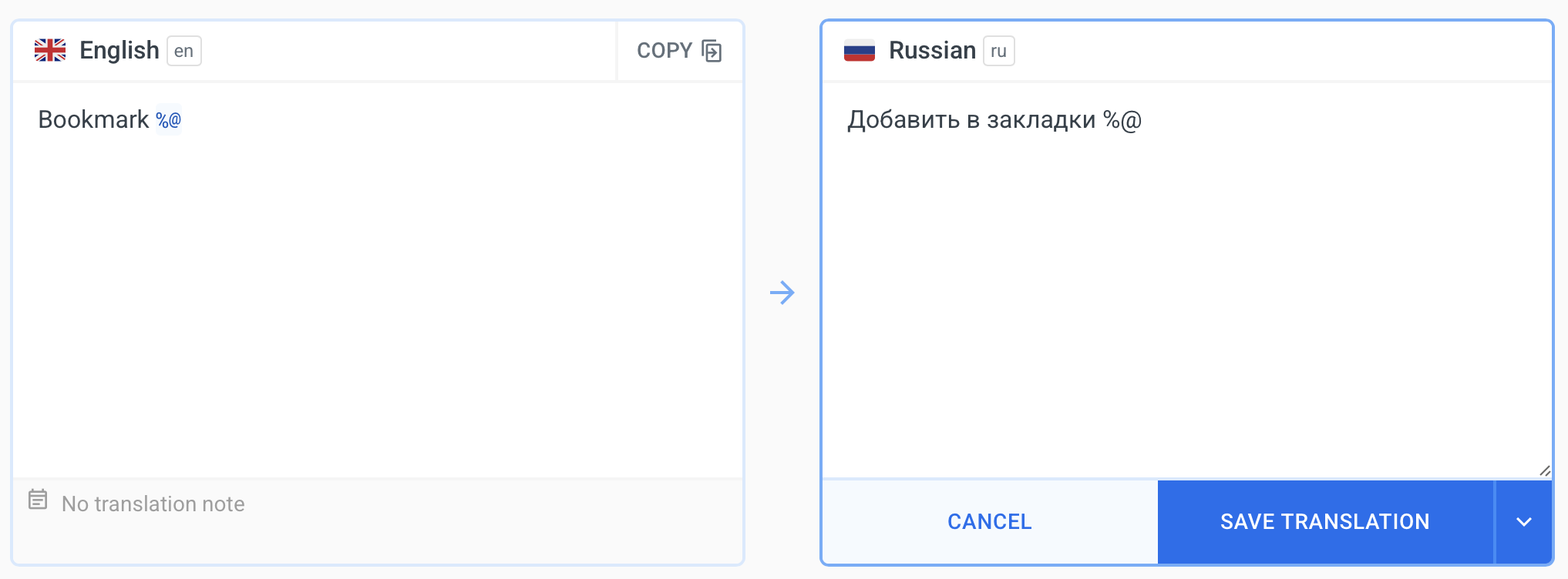 - In Image 2, the translation for "Suspend Tabs" is shown as "Заморозить %@ вкладок" which uses the genitive plural form regardless of the number.