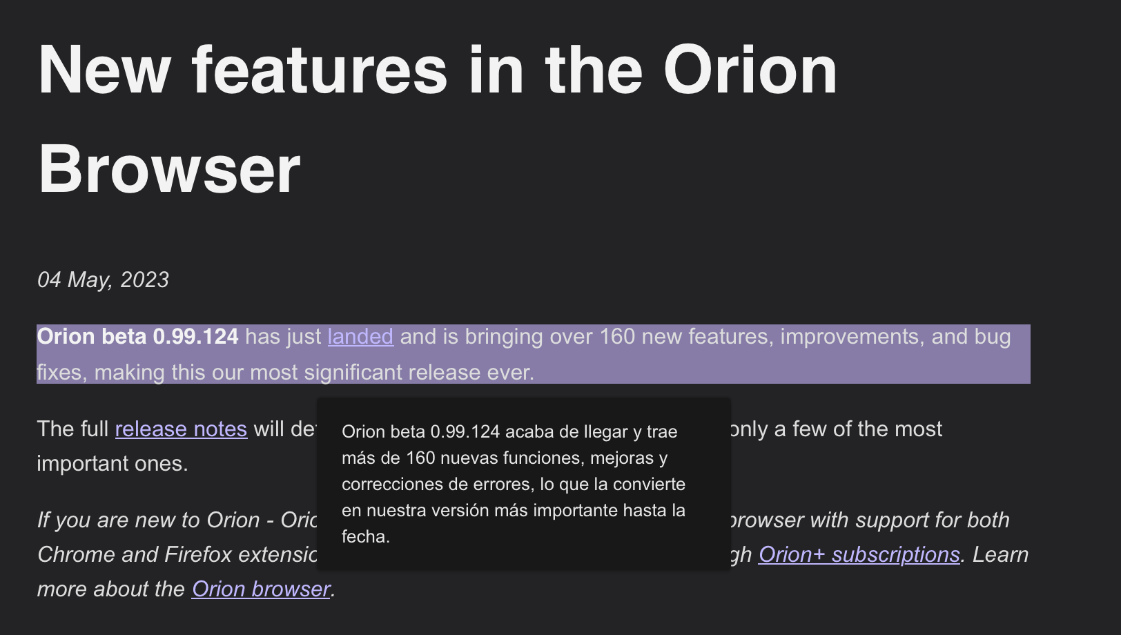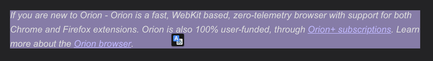 adorabilis Steps to reproduce: Install the extension from https://addons.mozilla.org/en-US/firefox/addon/simple-translate/ Highlight some text. Notice no translation button pops up. (Only the toolbar icon works.) Expected behavior: When text is highlighted, a translation button pops up and the translation is displayed instantly. Refer to https://addons.mozilla.org/en-US/firefox/addon/simple-translate/ for screenshots of expected behaviour. Orion, OS version; hardware type: Orion Version 0.99.109.1.3-beta (WebKit 613.1.12) macOS 12.1 MacBookPro15,2