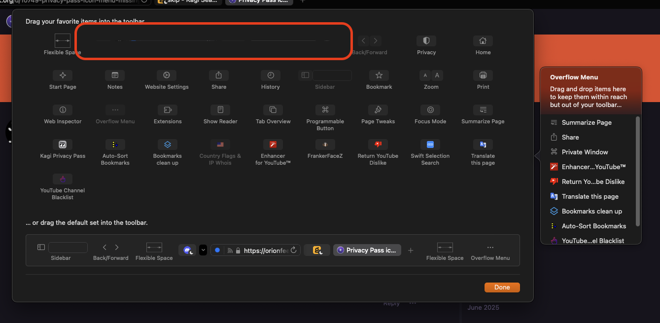 JSiuDev Steps: Use compact tabs Customize toolbar Cannot interact with it. Not sure what is it for. And don't recall seeing it before. Version 0.99.134-rc (WebKit 622.1.9.19.2) Sequoia (15)