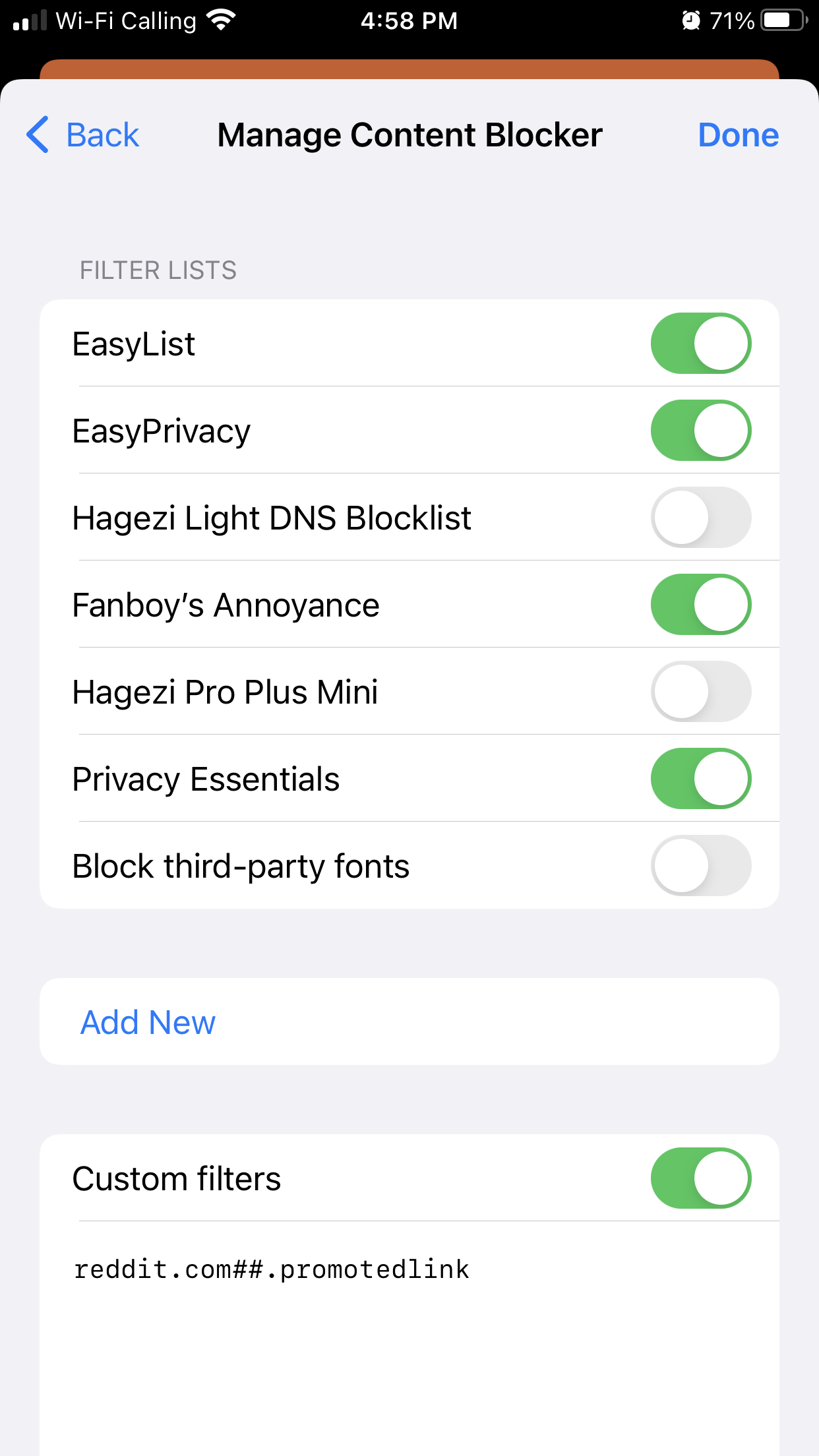 I tried to enable multiple ad filter lists and it ended up crashing. Here is what I tried to enable.