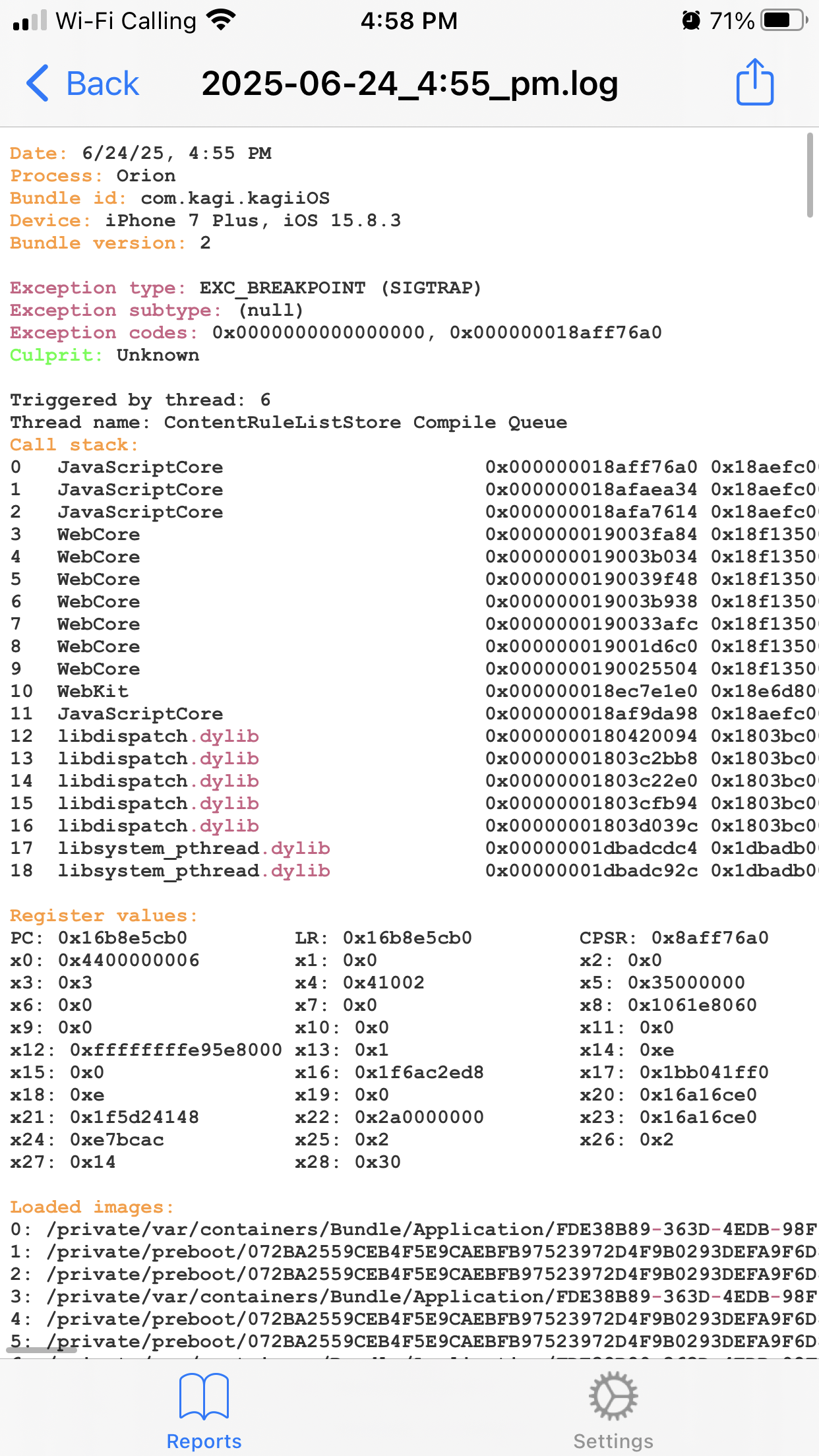 I have a jailbroken iPhone with Cr4shed and this is what it reported.