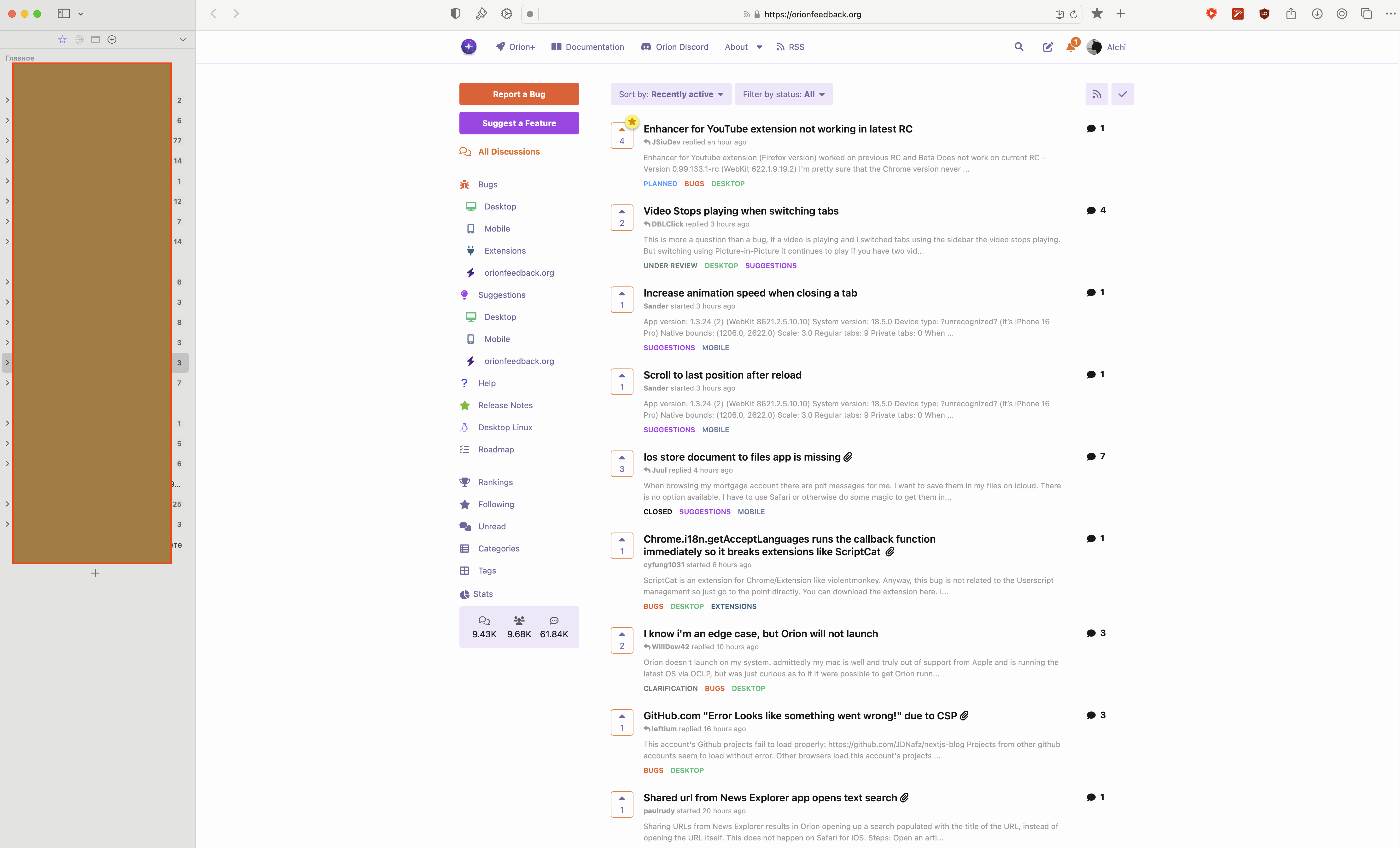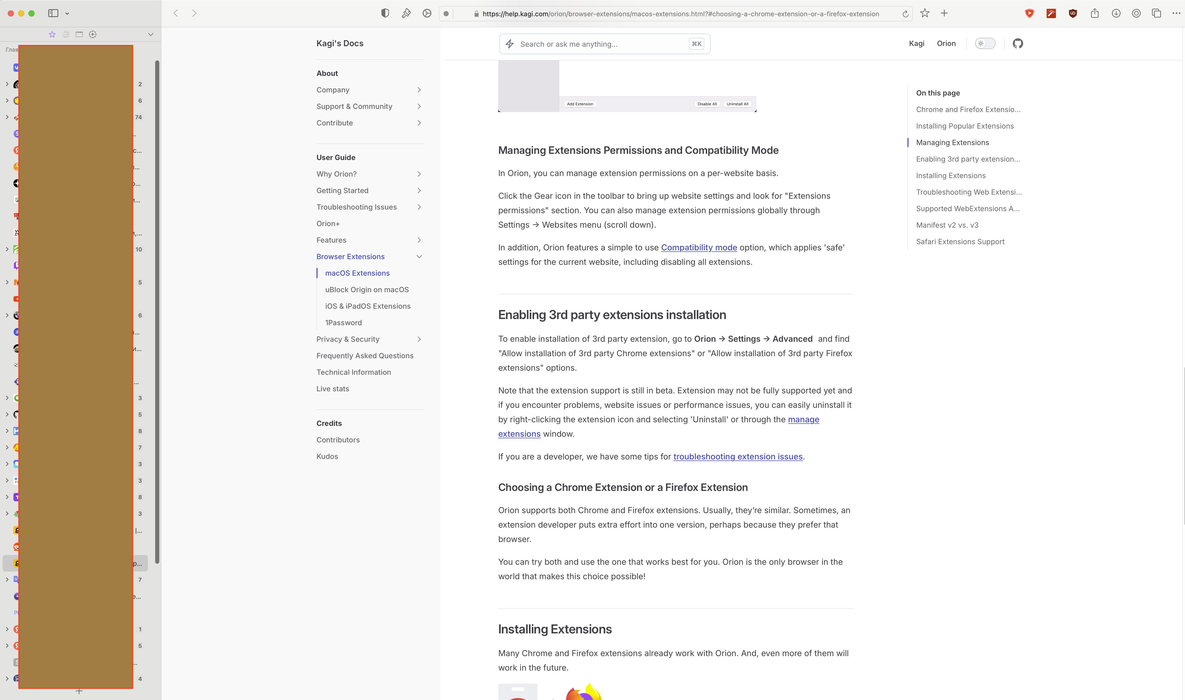 Extensions only have Enhancer for Youtube (not working by the way since 1-2 Orion versions back) an uBlock origin (Firefox) and Tab Session Manager (unfortunately it can automatically save every session but can not restore tree structure. Switching off extensions doesn't influence on bag. Using Orion for one month only so it's not overloaded with extensions.