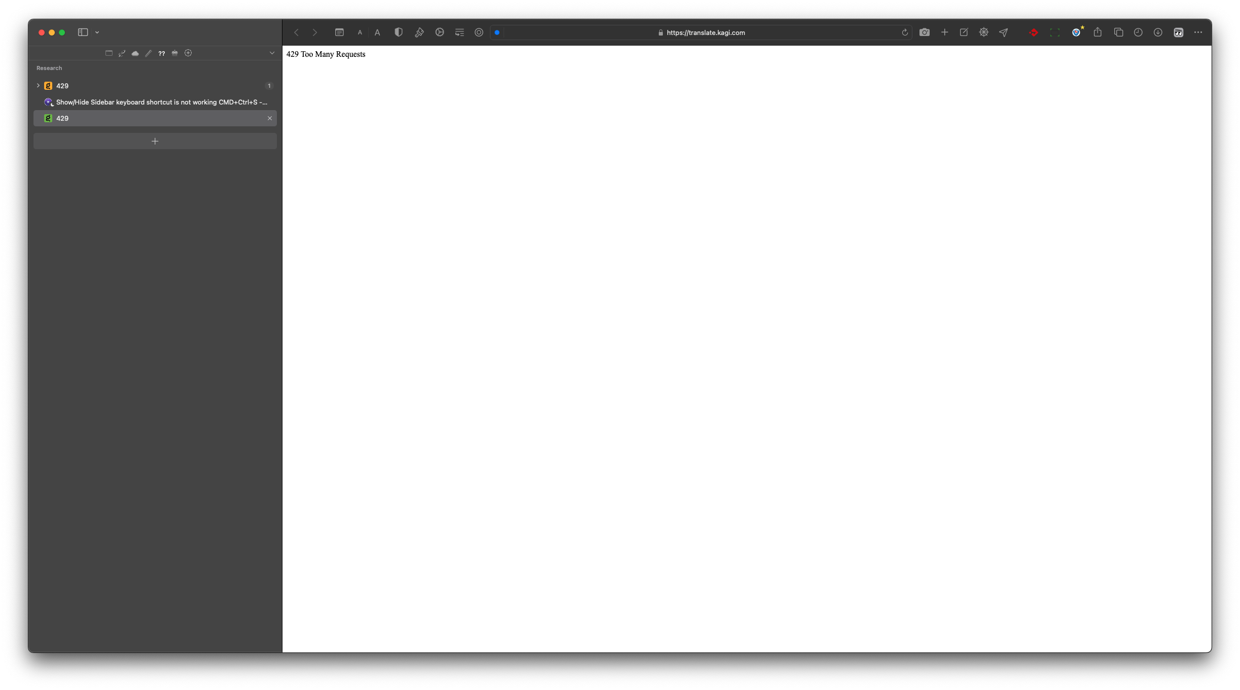 PVY https://translate.kagi.com is broken @Vlad Websites reloads itsefl and ends up with "too many requestes" Chache cleaned" Version 0.99.134.1-rc (WebKit 622.1.9.19.2) Sonoma (14)
