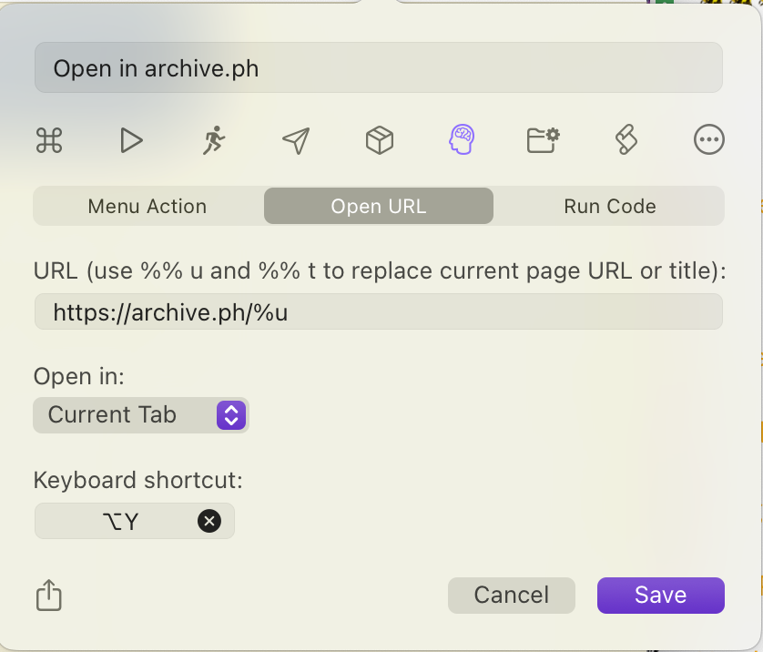 Then click save! Now you can quickly and efficiently open the page in archive.ph (or any other archive service by editing the URL), including using a keyboard shortcut!