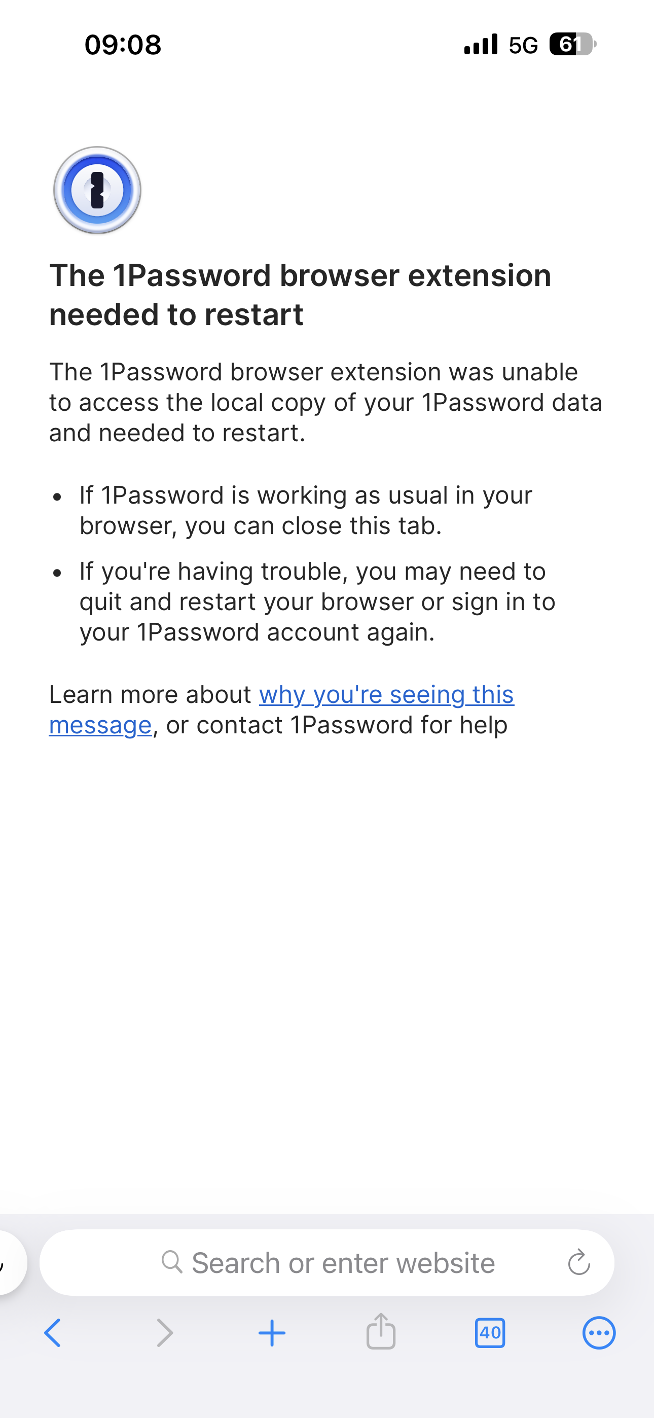 Often when I click on a link in iOS, Orion, I get an error, pop-up warning that “The 1Password browser extension needed to restart