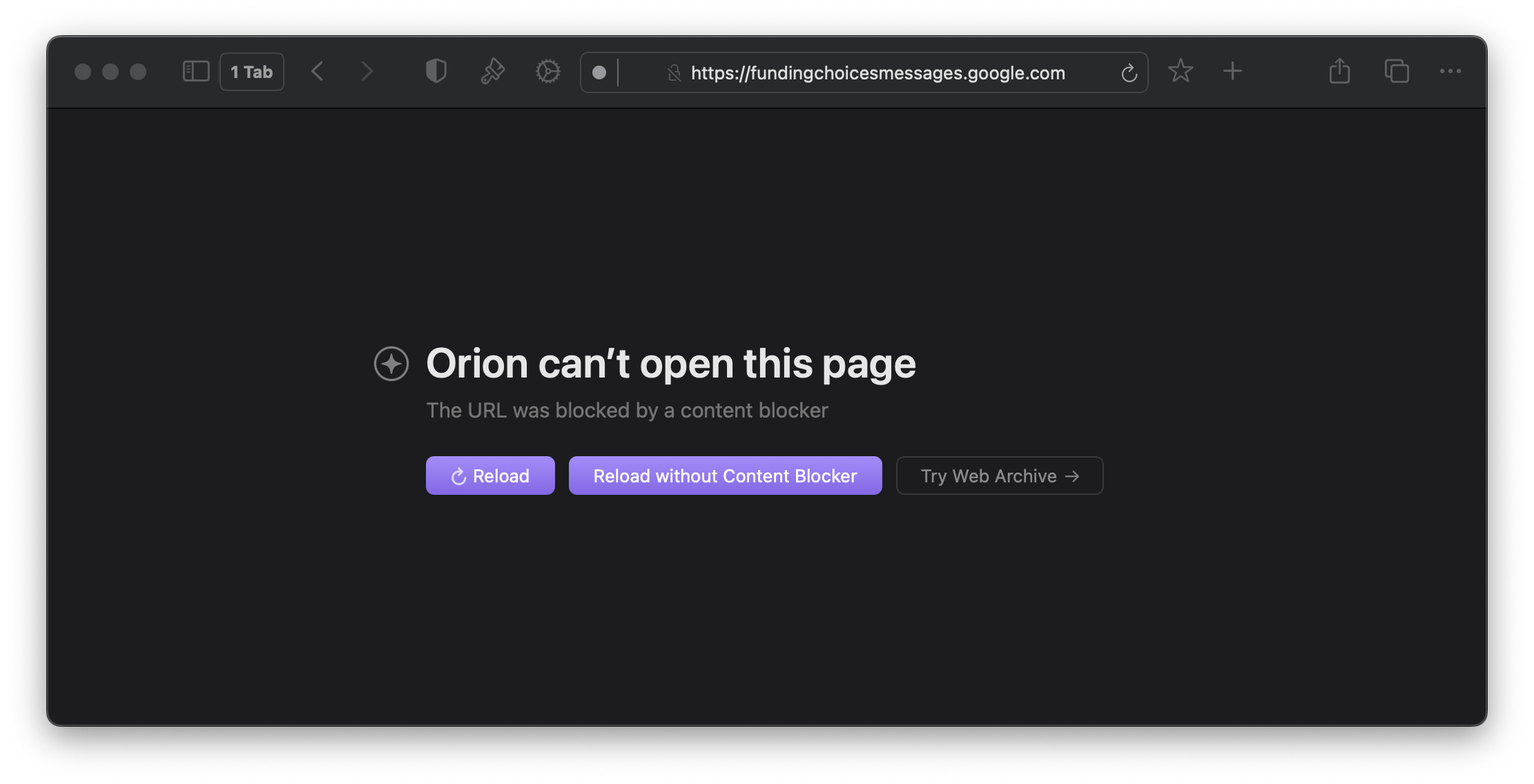 Now let's completely close Orion and reopen it. If we then try to access "platform.tumblr.com/v1/share" again, the URL will load like if it wasn't in any content blocker lists: