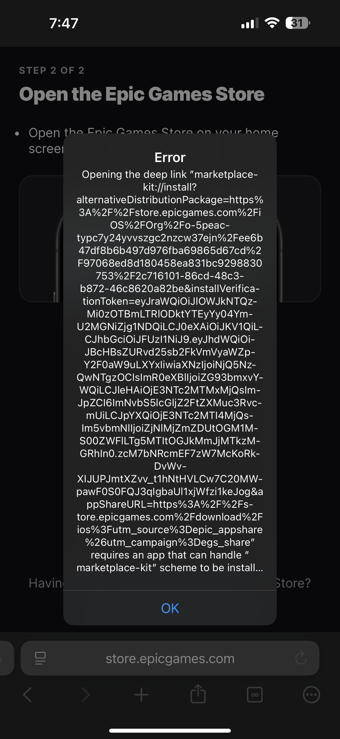Deep links using the marketplace-kit:// scheme fail to open in Orion, even though the option to allow external link handling is enabled in the settings. When attempting to open such a link, Orion shows the system error message: “requires an app that can handle scheme.”