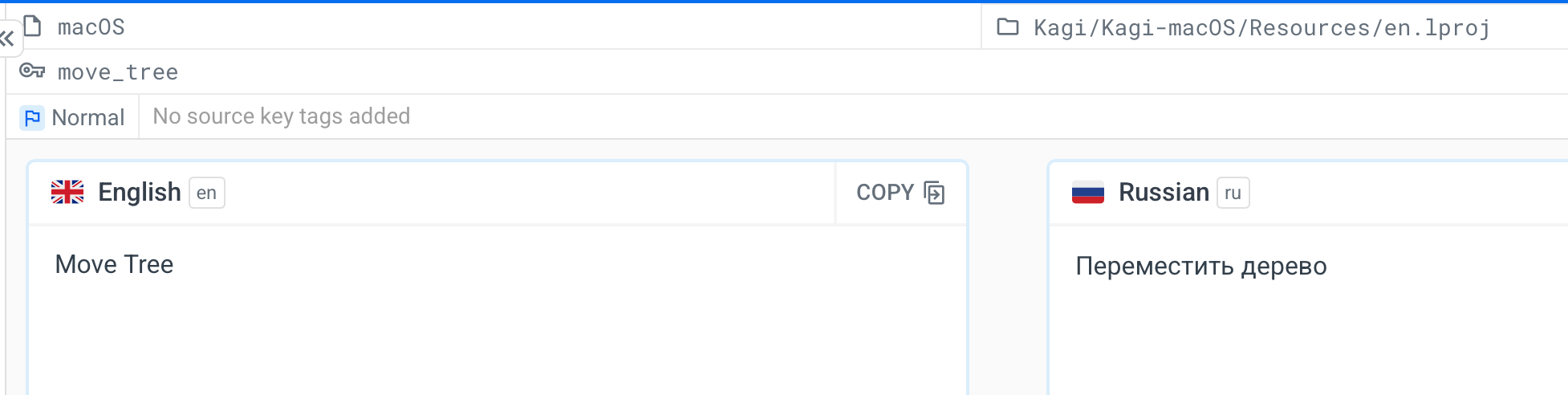 The menu item "Move Tree" appears in English instead of its Russian translation "Заморозить дерево" in the application interface, despite a translation string being available in the Localazy localization platform.