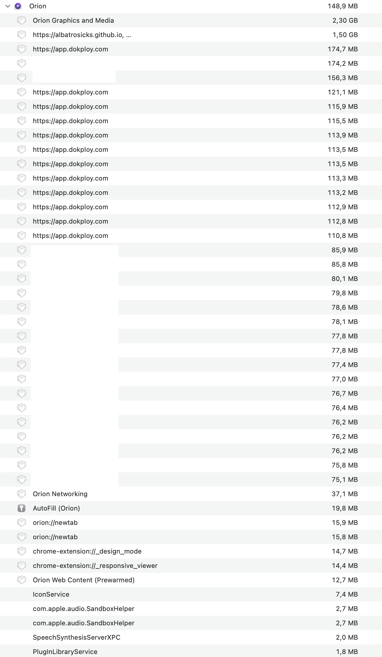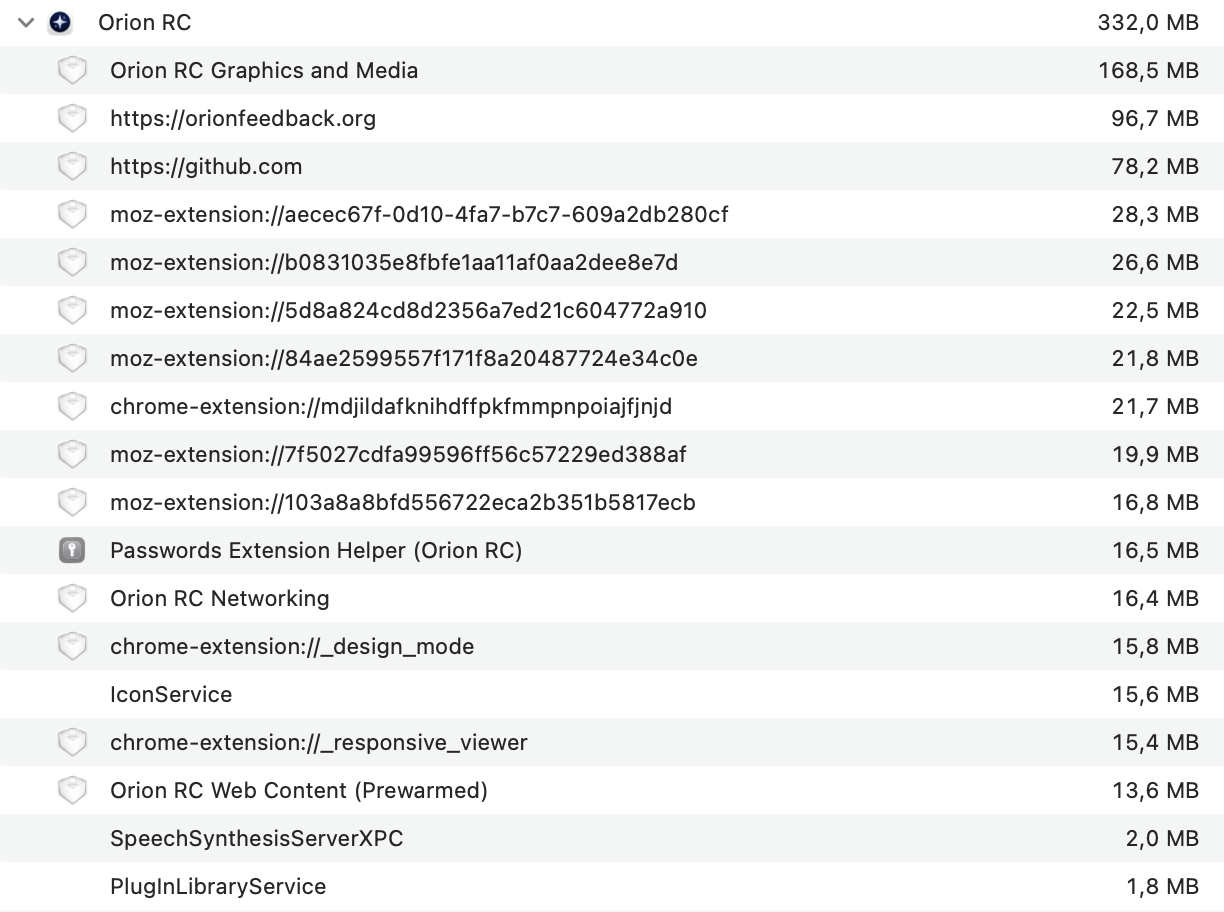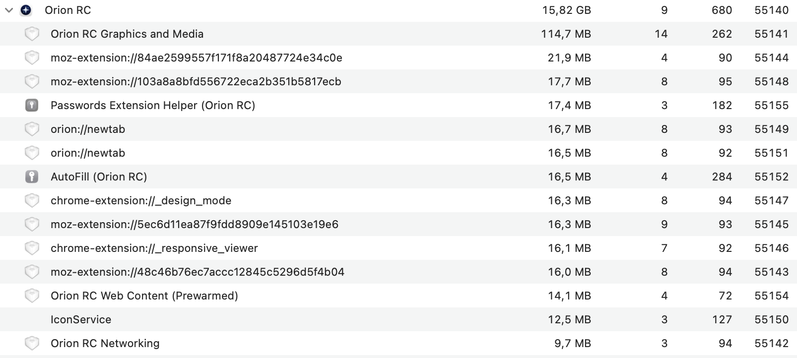 I'll post here since it's more related to create new thread. As I've written before, I set it up on a new, clean profile. However, a few hours after my post in the previous thread, the memory consumption for the Orion RC process grew to 5+ GB (sometimes spiking to 15 GB), while all tabs and extensions seem to be within normal limits.