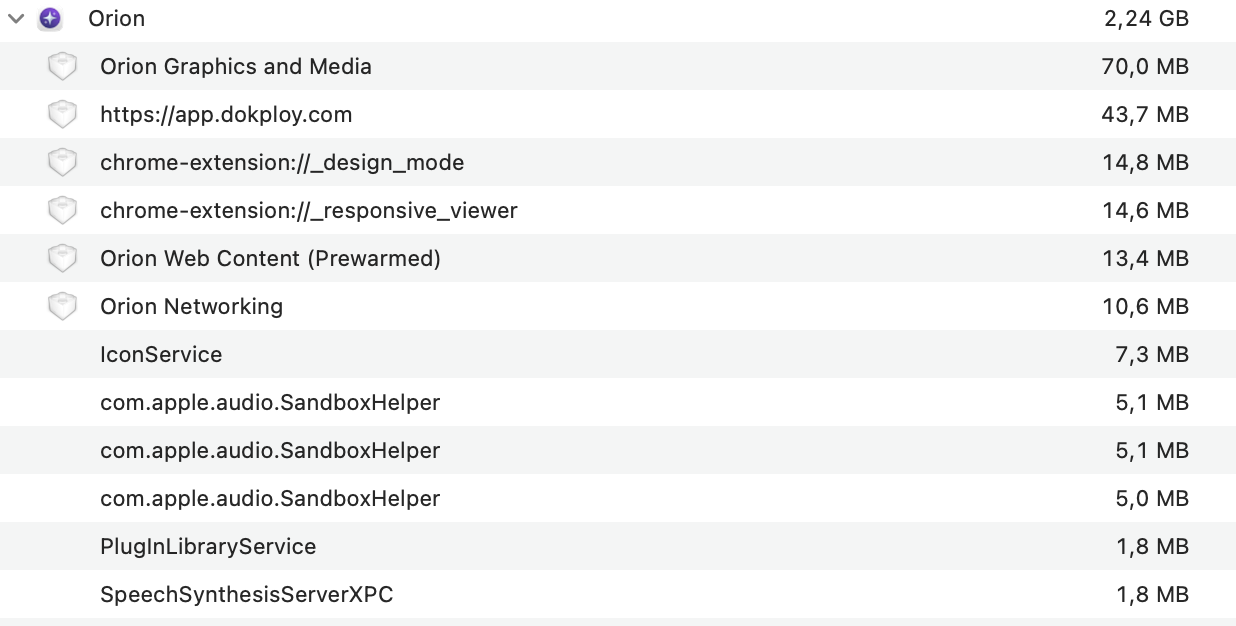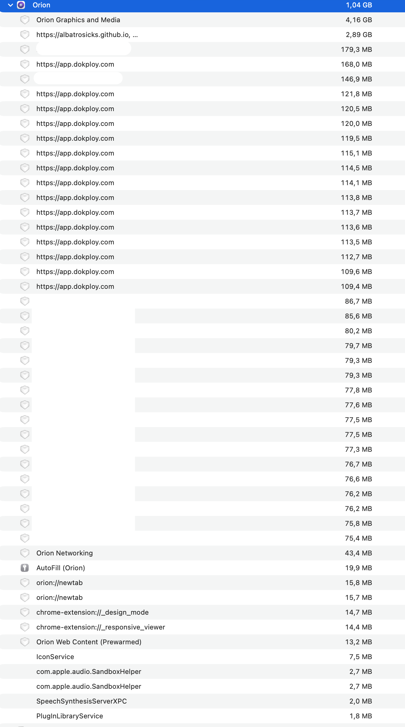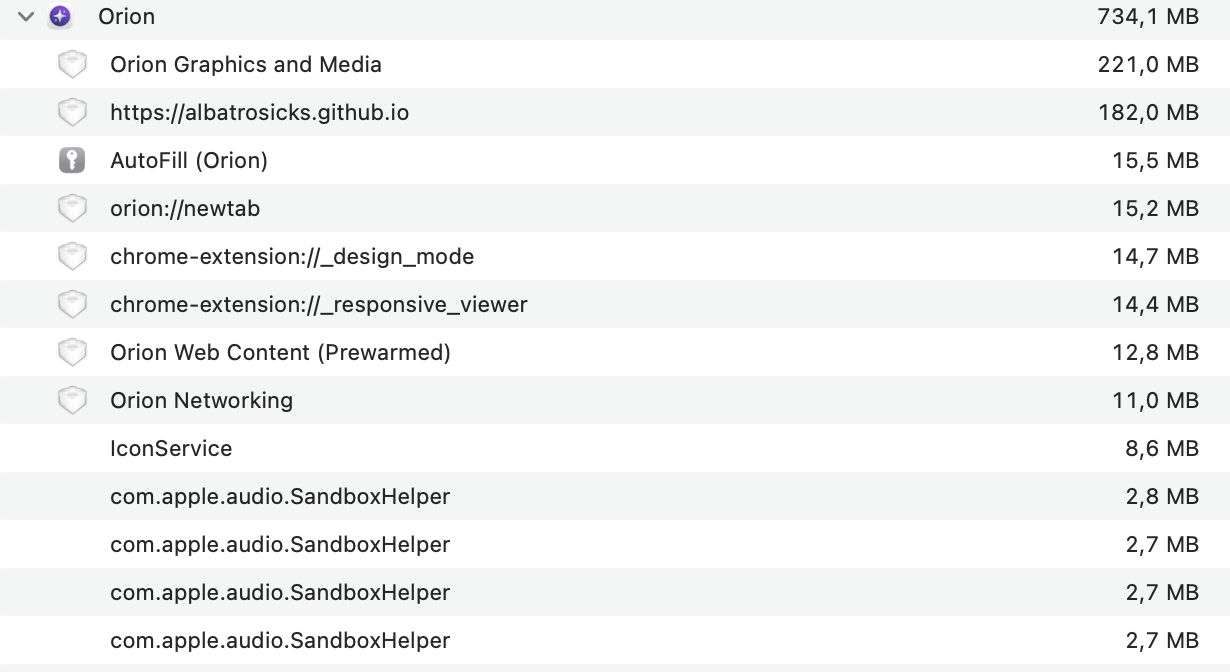 I'll post here since it's more related to create new thread. As I've written before, I set it up on a new, clean profile. However, a few hours after my post in the previous thread, the memory consumption for the Orion RC process grew to 5+ GB (sometimes spiking to 15 GB), while all tabs and extensions seem to be within normal limits.