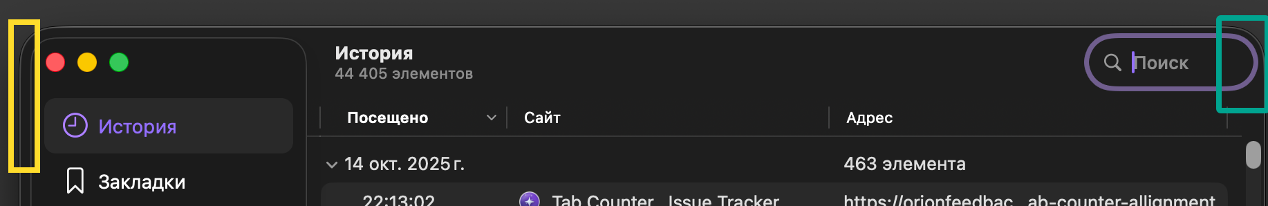 It seems padding off a Search field in Browser History is broken. Search looks closer to the border when Searchlield is activated: