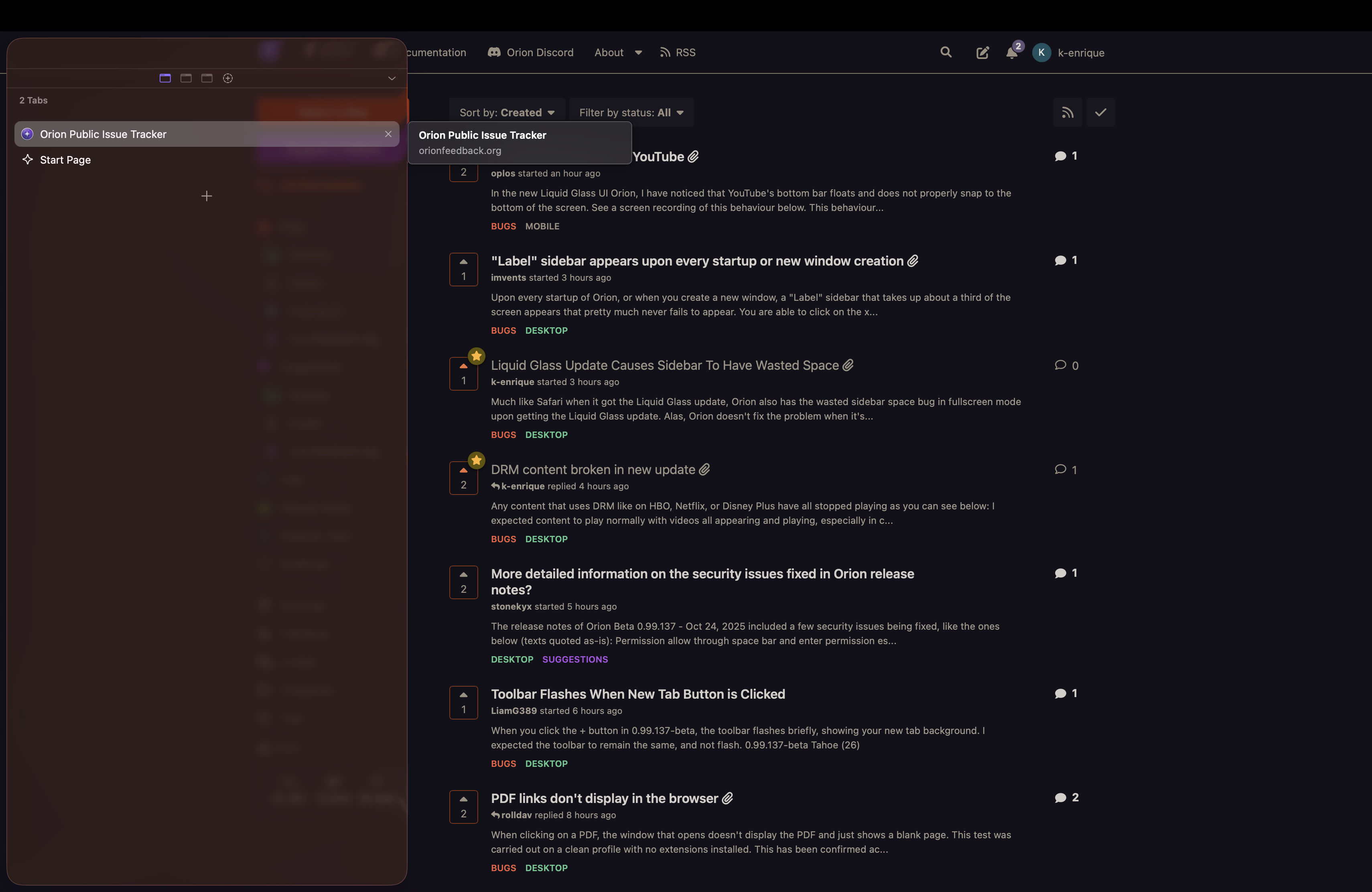 Much like Safari when it got the Liquid Glass update, Orion also has the wasted sidebar space bug in fullscreen mode upon getting the Liquid Glass update.