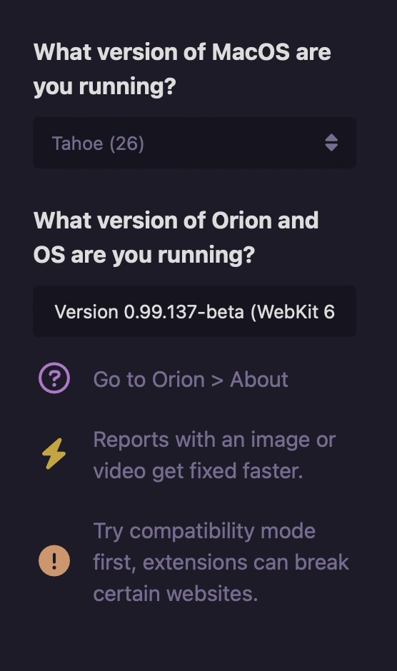 The prompt to make issues asks 'What version of Orion and OS are you running?'