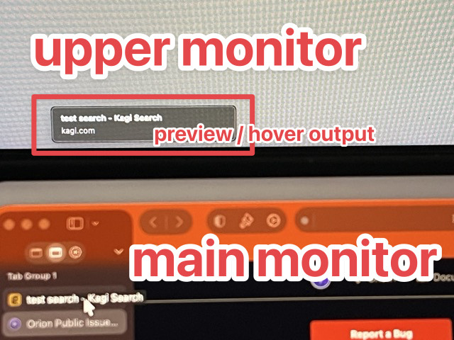 When using Orion 1.0.0 (139), I find that when I hover over vertical tab entries on my macOS primary display with another display above it (I have several monitors), the preview does not draw to the right of the tab entry, but rather instead renders on the display above this main monitor. This is a strange issue, but Orion is using the full screen real estate and somehow I suppose it thinks it must draw the preview on the first available space it finds above the app...