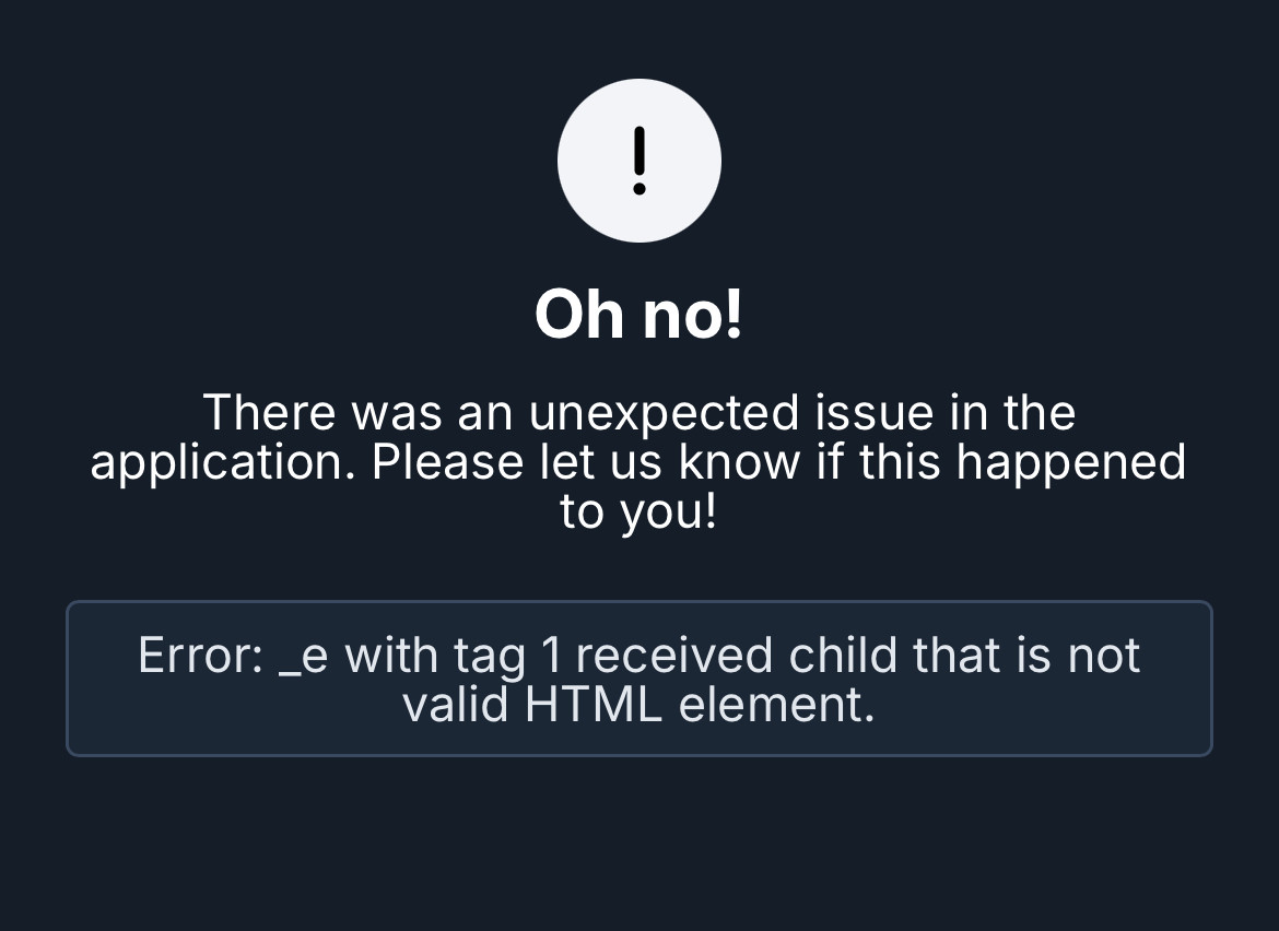 While logged in to bluesky most of the site works fine but some pages, including profile pages (https://bsky.app/profile/bsky.app for example) or the search page show the error “Error: _e with tag 1 received child that is not valid HTML element.”