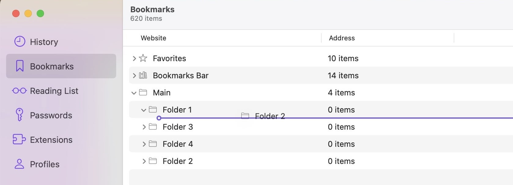 I’m having trouble reordering my bookmark folders in Orion without accidentally nesting them. Whenever I try to drag a folder up or down in the sidebar between other folders, it never stays at the top level. Is there a trick to this? It feels too basic not to work.