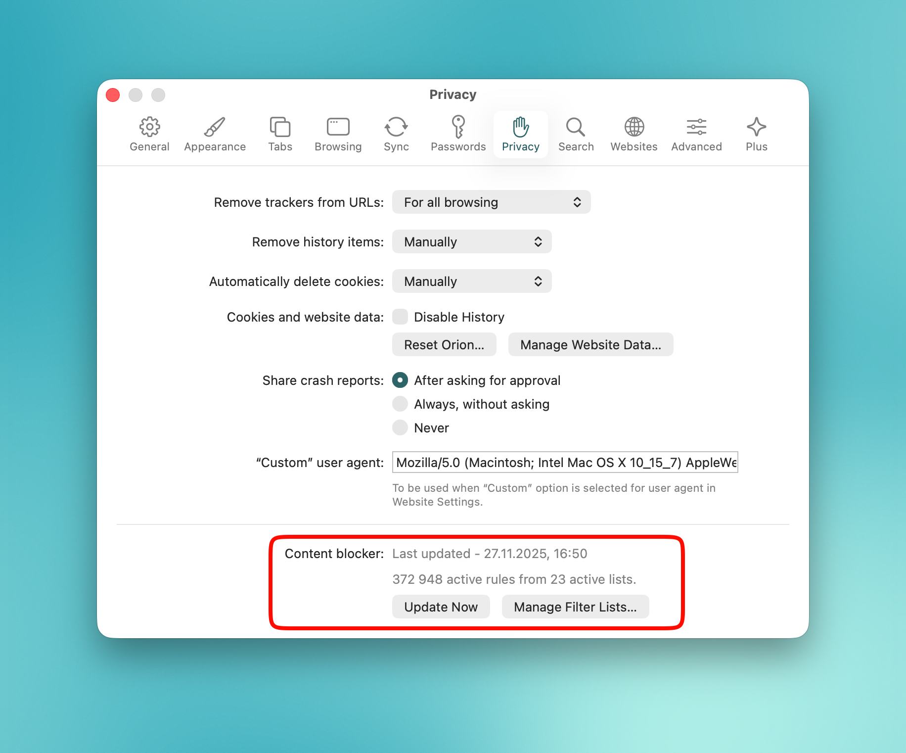 timii0x hello im love securty and stuff but now orion have good blocking stuff isnide but im use custom DNS and i dont need duble filtering if is posble to add just blak space removed css who dont use any blocking filters in orion browser thanks