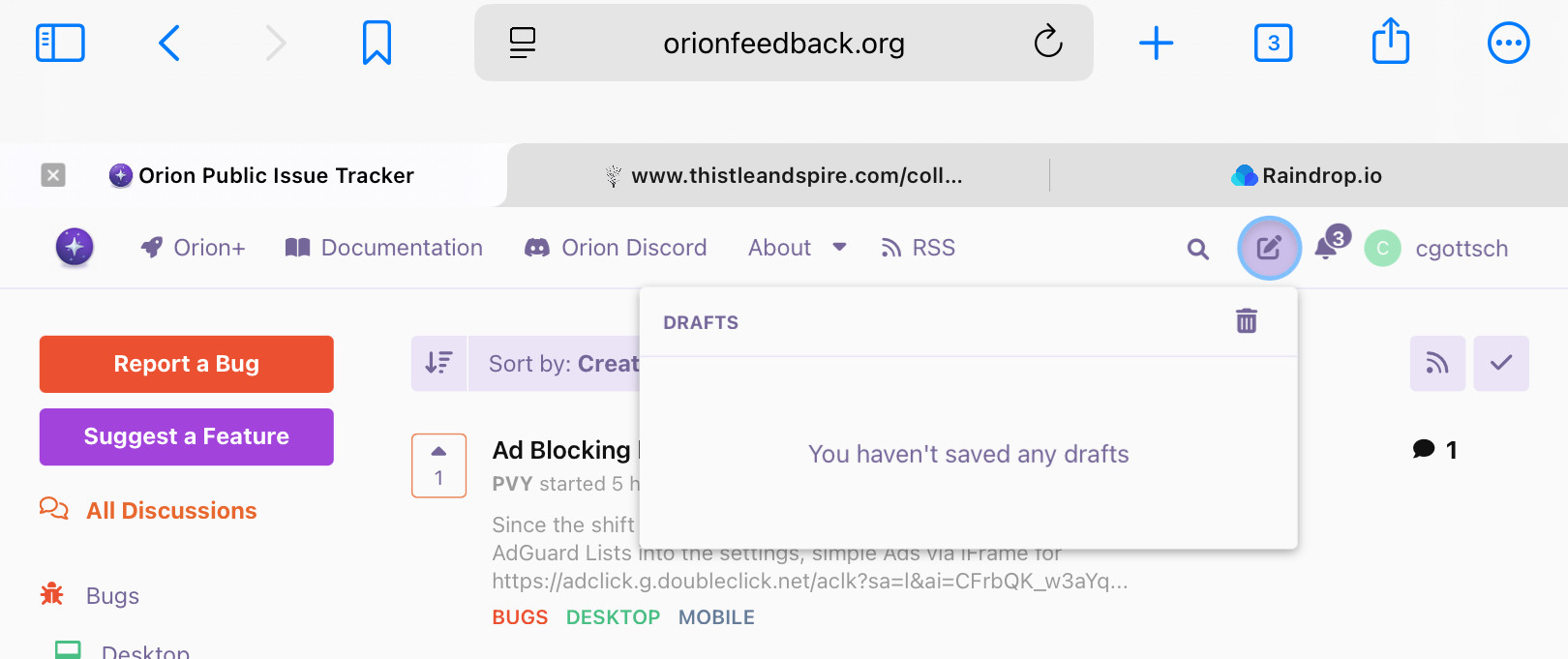 i clicked save draft, and after a short pause, i get a message that says "draft saved". however, i dont see any drafts in the drop down. trying again results in the same behavior. attempting to close the draft gives me the warning dialog asking if i want to discard. if i discard, and check my drafts later, still no drafts saved. BUT THEN, i started thus bug report, and strangely, under the Drafts dropdown, are three copies of the draft i tried to save.