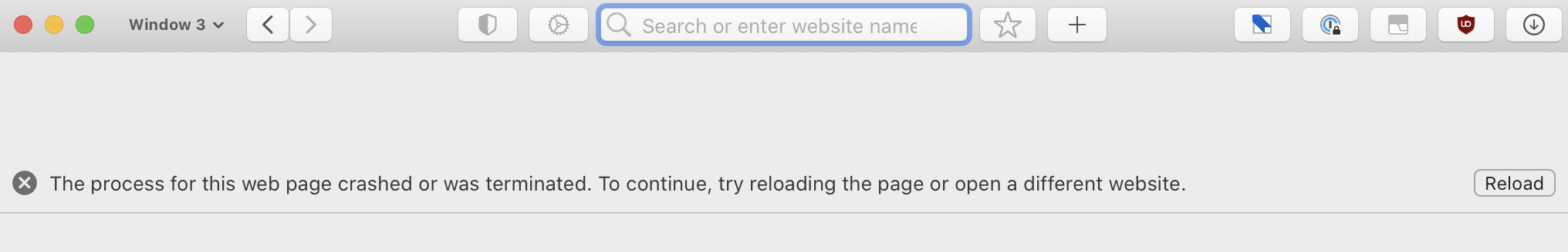When I open the linked page, I do not get an error message. I just get a blank page, and the URL is cleared (as reported). I can confirm that Command-W does not close the tab, nor does Command-Shift-W close the window. Selecting either option from the File menu works as expected.