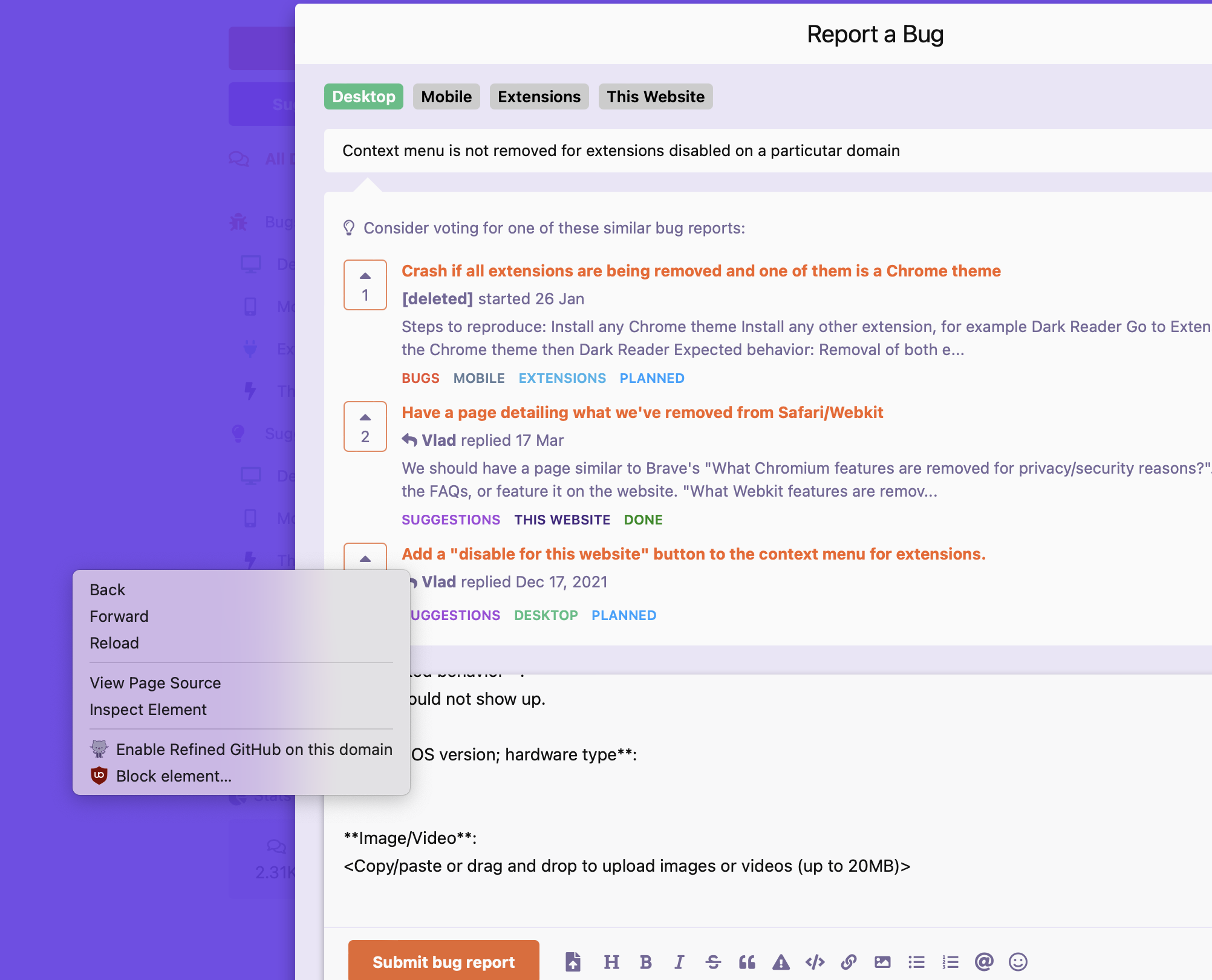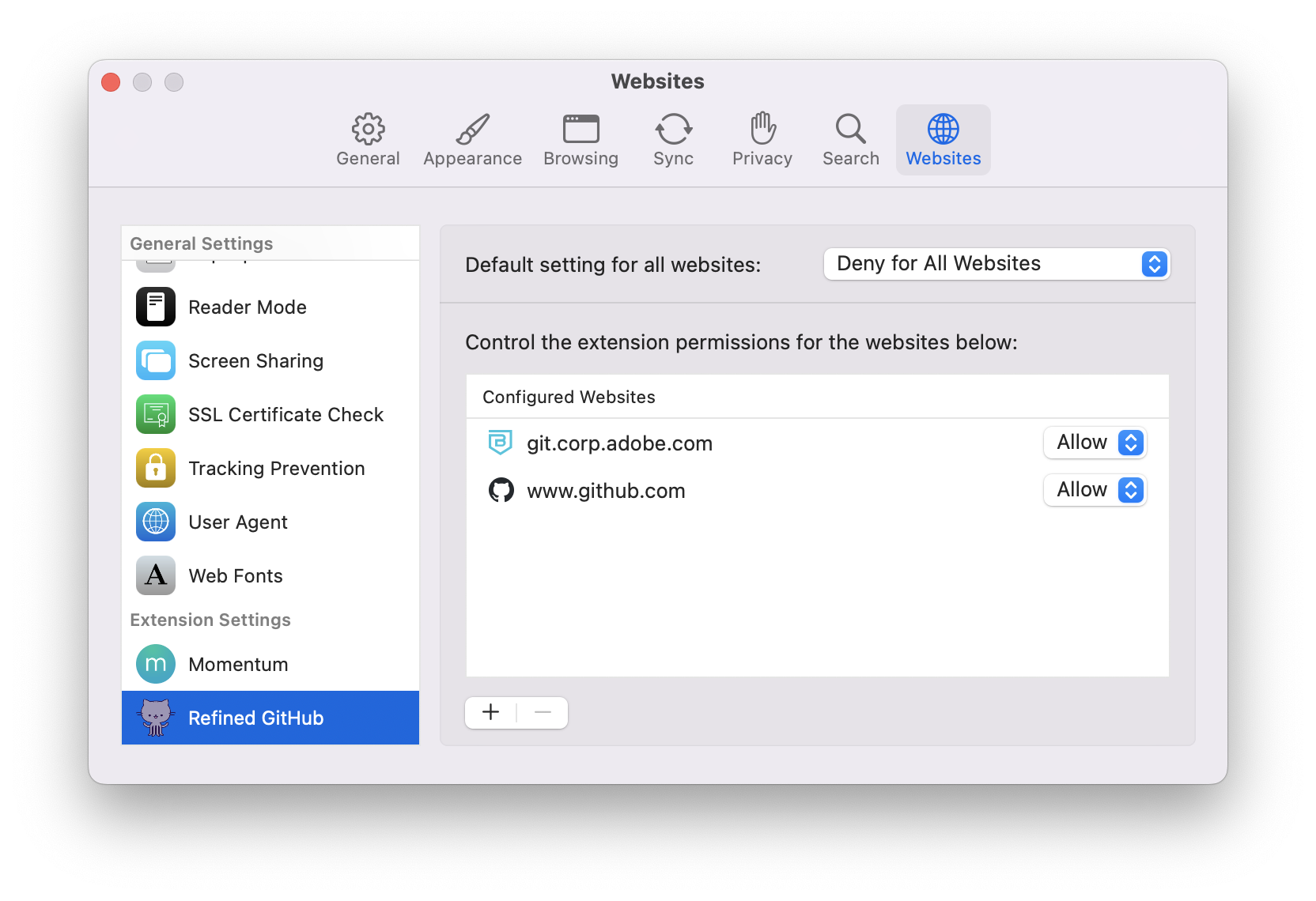 Install an extension that sets up a context menu. I use "Refined GitHub". Disable it for all domains expect for one (E.g. deny be default. allow only on GitHub.com.)