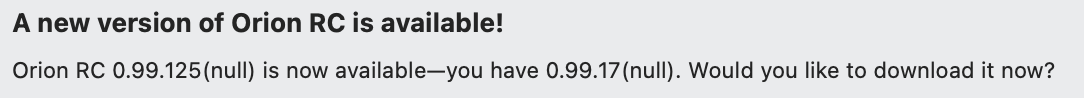However, the OrionRC icon is different, it's Navy Blue/Really Dark Purple compared to Orion's Purple. Unless your mac isn't refreshing icons, you must be opening the wrong program. Keep in mind RC is an entirely different app to Orion, not an "Update".