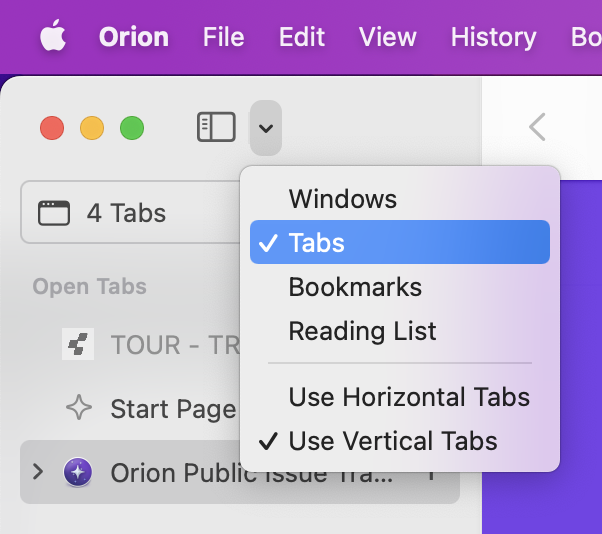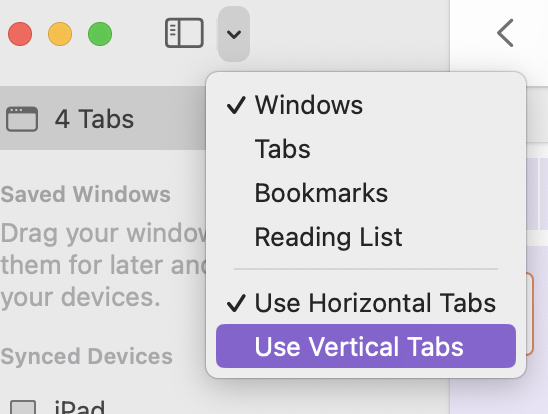 Also, I quite like safaris behaviour of letting "unfold" your tab-groups which makes changing the sidebar view from "windows" to "tabs" obsolete and also lets you drag and drob tabs between differenzt tab groups. This makes it easy for me to rearrange my different tab groups, representing different tasks, topics or researches where I might discover something in tab group A that later on is better to be in tab group B.