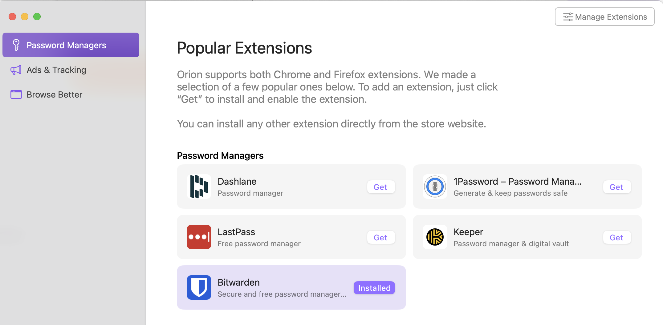 The Bitwarden extension (Google Chrome extension) doesn't works in Orion Versión 0.99.126.1-beta (WebKit 618.1.2) in macOS Monterey 12.7.