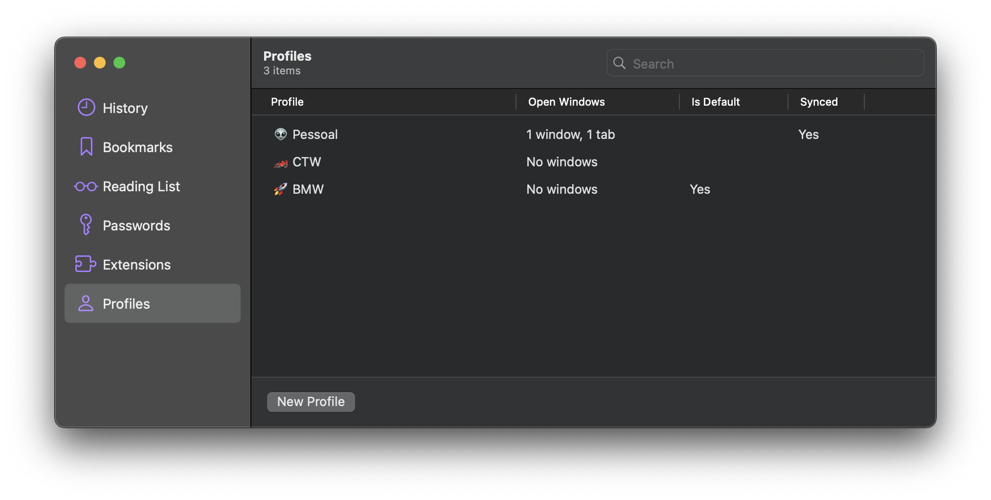 To open this profile I need to open Orion.app and go to File > Profiles > Pessoal and it opens. Strange thing is that it changes the Orion.app icon to the correct icon with the emoji from the Pessoal profile but does not change the name.