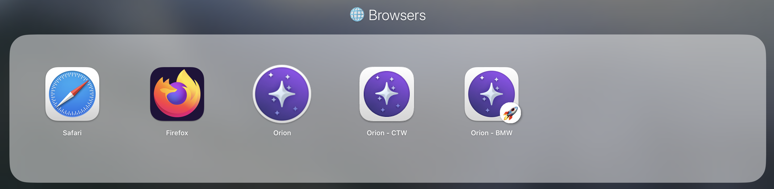 Clicking Orion - CTW or Orion - BMW does open these profiles, but clicking Orion.app does not open the Pessoal profile, as I would expect.