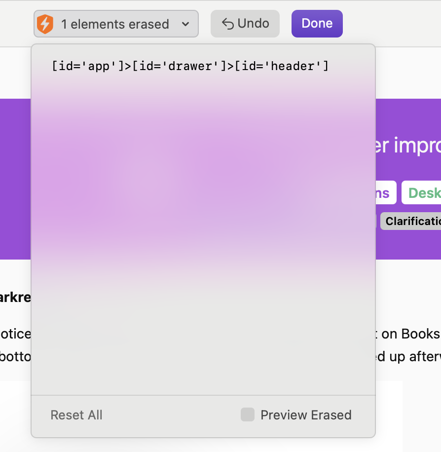 - I'm left with something, IIRC, like "5 elements erased" and the option to undo, but no means of editing those elements or understanding what was blocked: is it the ID, the class name, the entire tag? What if those tags are dynamic?
