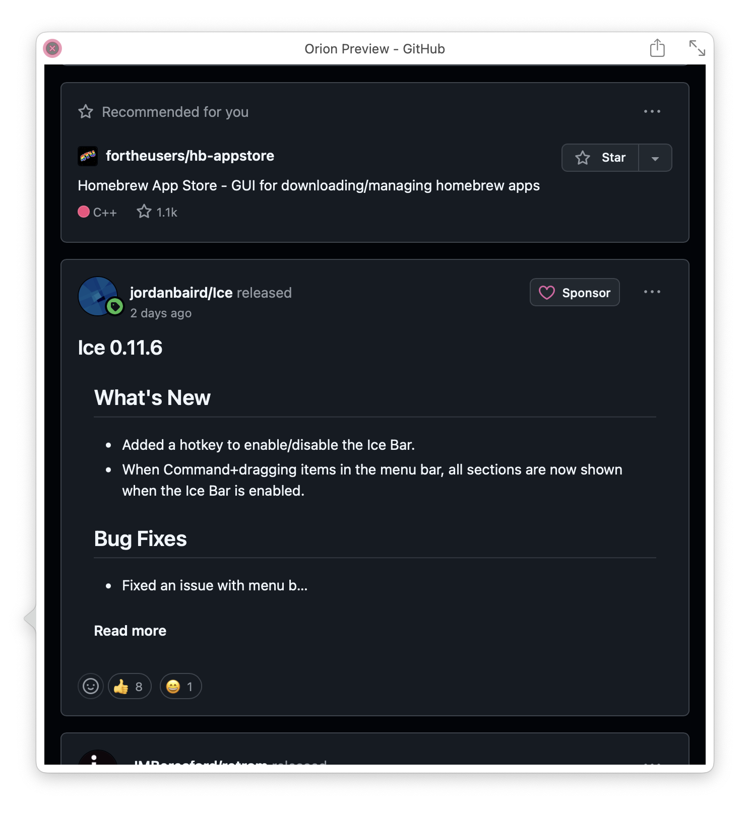 Whenever I open a link preview when macOS dark mode is on, the link preview always uses Orion dark mode feature, which tends to look quite bad, especially on websites that already use a dark colour scheme.