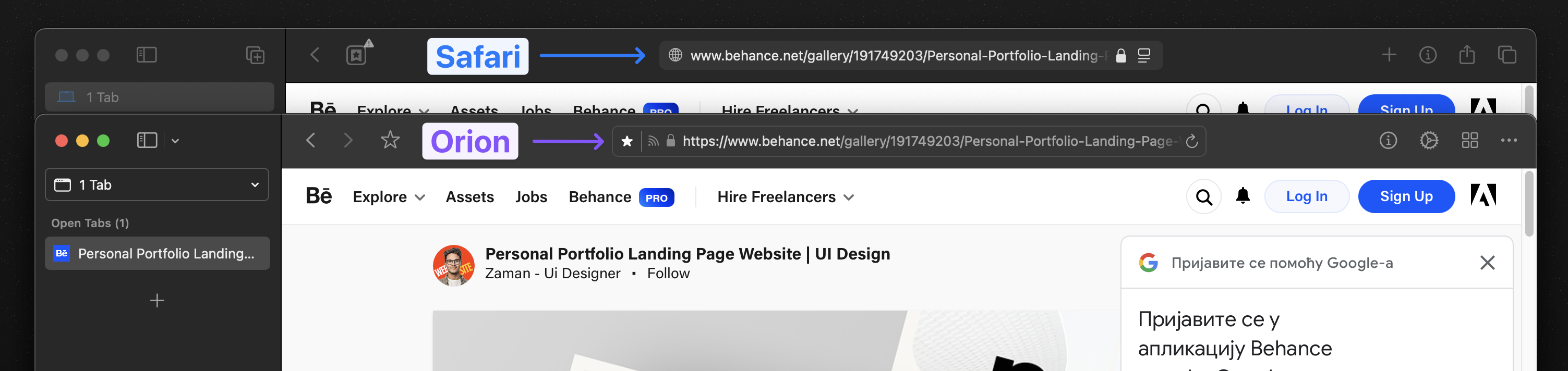 milos If the goal is to follow Safari aesthetic, Orion should drop border around the URL bar and go with the background color instead. This should give it a more modern feel, and less obstructive look.