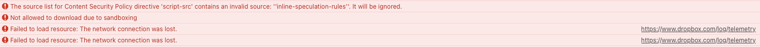 Also, the error "Not allowed to download due to sandboxing" does sound likely to be part of the issue.