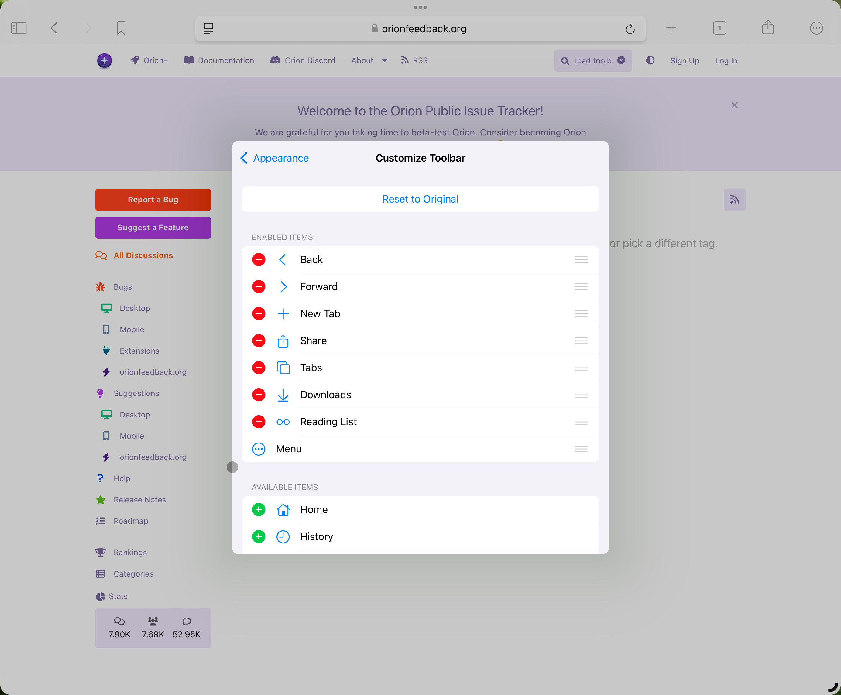 Changes to the new "customize toolbar" setting don't take effect on iPadOS, and when I hit "reset to original" the whole app crashes.