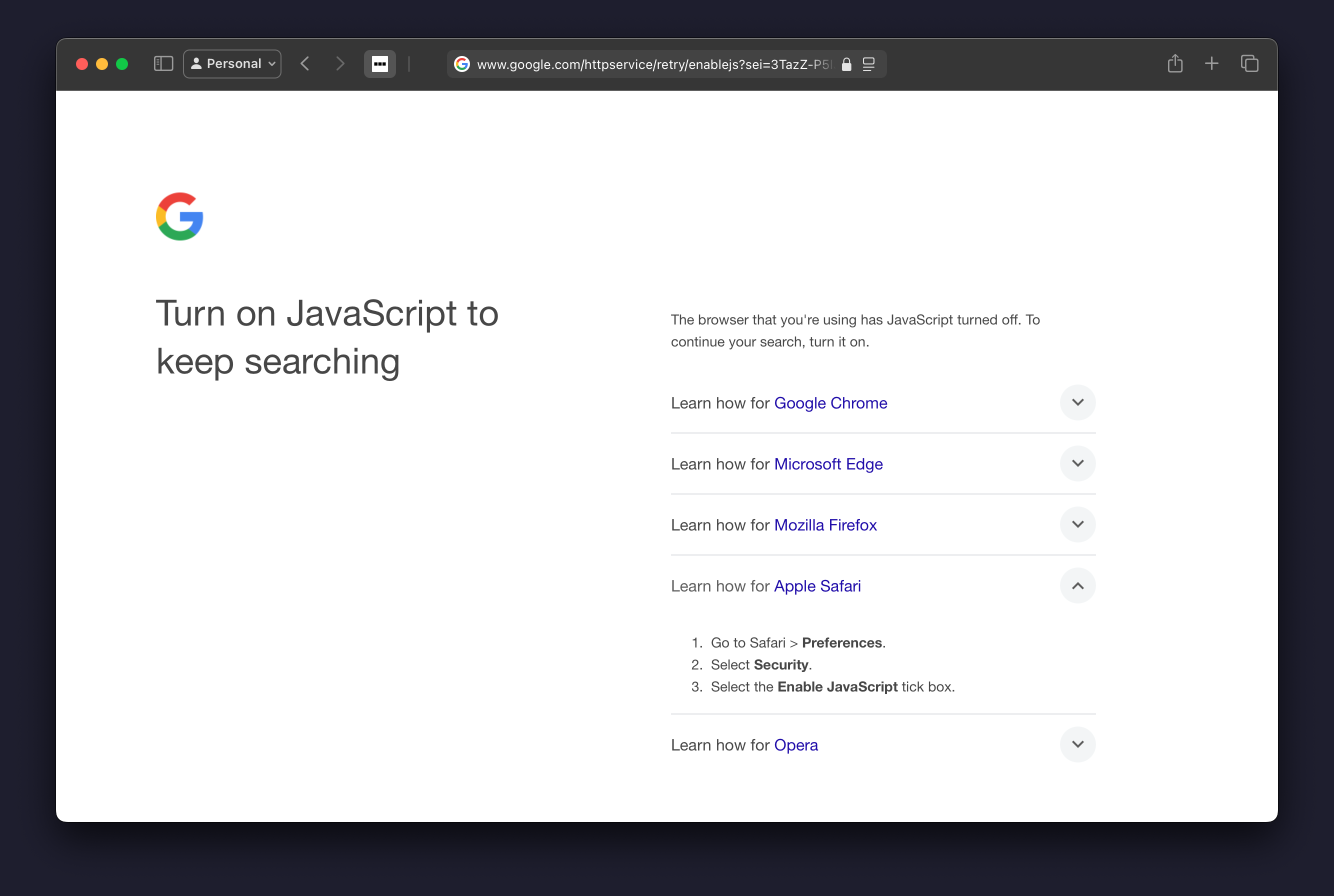 laiz This change was made by Google earlier this year. There is nothing Orion can do about it. Even on Safari, I am unable to search Google with JS disabled: Further reading: https://news.ycombinator.com/item?id=42719865 https://techcrunch.com/2025/01/17/google-begins-requiring-javascript-for-google-search/ I recommend looking into other search engines, with https://kagi.com being the obvious best option.